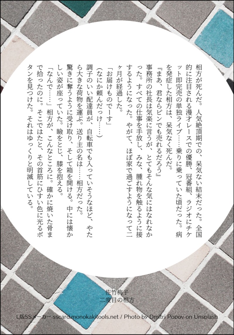 twilight_topaz☆quiet followMEMO相方が死んだ。 #小説 novel #創作BL Original Bl Tap to full screen (size:954x1365).Repost is prohibited Let's send reactions! freqpopularsnackothersPayment processing Replies from the creator Follow creator you care about!☆quiet follow twilight_topazDONE性癖パネルトラップログ1:攻めのちくび責め 玖路×汐音2:アニ●ングス ラッシュ×ムース@なっきー様3:受けのちくび責め 是愛×耶雉4:受けの玉責め 夕陽×千蔭@白湯すい様5:攻めの会陰責め 西郷×源@左田ナギ様6:顔面騎乗 薫×勇人@引田ロング様7:攻めの連続絶頂 赤伯×青明8:舌フェラ 主計×純名お付き合いありがとうございました! 8 twilight_topazDONE愛し君よ、螺鈿の光を指先にのせ / ヒース×レオ(青年期)いまりさんご本人にリクエストをいただきました。ご要望により転載しております。 4510 twilight_topazTRAININGムラムラ是愛(ポイントは念仏をとなえるところ) twilight_topazMOURNINGずいぶん前にお借りした「えっちな表情テンプレ」ここの存在思い出したので上げてみます☺創作BL『わたしのお父さん』より耶雉で書きました twilight_topazMOURNING【ガラスの靴はいらない】童話風BLで真っ直ぐな少年×好色な靴屋さん 3 twilight_topazTIREDお題で書き始めた東方の青年と西方の若き王 少し情けない感じの王様と、賓客として招かれた青年って感じでしょうか……まだ左右も決めかねています、どっちでもいいかな 8 related works かほる(輝海)INFO平成最後にネップリ折本出します。A6サイズ8ページ。R18小説を二本収録。そのうち一つは、ここで公開済みの「路地でもっこりする二人の話」です。コードは29日の夜遅く(30日に日付が変わる頃)に支部で公開します。サンプルで1ページだけチラ見せ。よろしくお願いいたします。 文月ちえり&中の人MAIKING作業進捗?みたいな感じの投稿だけど、現在Newお仕事に夢中で絶賛放置中な執筆中小説の一つ。第1章の序盤で、サイトにて公開中な10,000文字の約半分相当です。#青春 #小説 #中学生 #オリジナル#自家製本 して書籍化予定です!#文学フリマ #前橋 #東京 #文フリ 出店予定 14 zeppei27DONEなんとなく続いている主福のお話で、単品でも読めます。七夕を楽しむ二人と、夏の風物詩たちを詰め込んだお話です。神頼みができない人にも人事を超えた願いがあるのは良いですね。>前作:昔の話https://poipiku.com/271957/11735878.htmlまとめhttps://formicam.ciao.jp/novel/ror.html 3654 ももみつDONEマターさんとクラフターさんの、日常の一コマ話。小説。 9 かほる(輝海)PROGRESSエアコミアンソロ進捗。やっと攻守交代まで来た(*´艸`*)そして、一番言わせたかったセリフまできた…あぁ満足…まだ終わらないよ(*´ω`*)肝心のセリフに字が重なってる…(´・ω・`)タップすると全部見えるようになります。 starareorangedrDONE恭龍の小説(まだつきあってない) 3 siro1516TRAINING『小さな子供との夏祭り編』2/2枚 10 kabolove22DONESSメーカーで作った小説です。 8 siro1516INFO先程お伝えした「小さな炭治郎くんと義勇さん」からのご挨拶と「お知らせ」を別で投稿です。 4