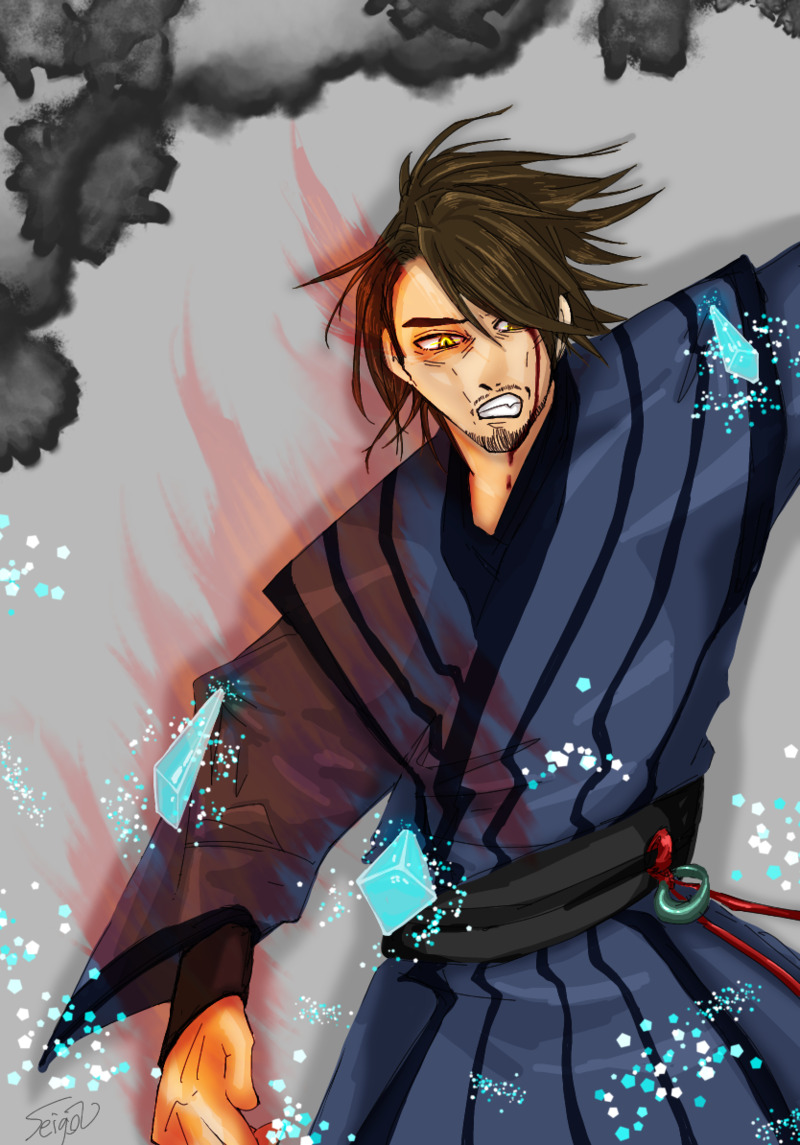 らくがき。燐塊のハンゾウさん。拙宅の燐塊ハンゾウさんは精神がやや不安定というか未熟?という設定がありまして、それにより時々アルカナが暴走→ハンゾウ自身を焼き尽くそうとするんですね。それを止められるのはビ・ハンだけで、ビ・ハンはこっそりそれを誇っているというかハンゾウにとって特別ポジな優越感があります。