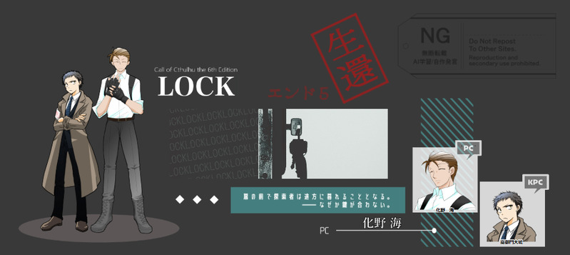 イカチャン☆quiet followDONECOC「LOCK」KPCとして化野くんに寄り添いました(シナリオの画面スクショです)面白かった~~~~!いや、まあ、大体、地の文担当で、はんちょすはただそこに居ただけなんですけどw無事生還! 良かった!! ありがとうございました Tap to full screen (size:980x438).Repost is prohibited Let's send reactions! freqpopularsnackothersPayment processing Replies from the creator Follow creator you care about!☆quiet follow イカチャンDOODLE「変装」用のキャラです柳河瀬霊示(やながせ・りょうじ)弟柳河瀬秀生(やながせ・ひでき)兄 6 イカチャンINFOエモクロアTRPG「変葬」DPC:柳河瀬秀生/DL:めりーさんPC:柳河瀬霊示/PL:イカリ生還にてシナリオクリアです!めちゃめちゃ楽しかったー! 兄貴(おにいちゃん)ーーー!!新規キャラでの兄弟でしたが、めっちゃ良かったです…、ありがとうございました! イカチャンINFO新クトゥルフ神話TRPG 「埋葬代行」KP/KPC(埴生輪樽)で皆さんと博物館に行ってきました。無事ご生還おめでとうございます!!(※バックは公式さんのトレーラー画像です)PC1:佐藤るね/PL:渡空さんPC2:晨夏織/PL:めりーさんPC3:越乃穂希/PL:オレンジさんPC4:茅原壱/PL:SuzukiさんKPC:埴生輪樽/KP:イカチャン イカチャンINFOCOC「祭りは良いなり、帰りは稲荷」お祭りで遊んできました~!無駄差分があるよwPC:高遠すみれ(PL:美夜さん)PC:翫沙霧(PL:めりーさん)PC:化野海(PL:オレンジちゃん)KPC:高御門大琥(KP:イカチャン) 5 イカチャンINFOCOC「気づいたらしんでた」KPC:化野海(KP:オレンジちゃん)PC:高御門大琥(PL:イカリ)こちらも無事生還でございます!(卓報告してなかった💦)楽しかった~! ありがとうございます!! イカチャンINFO「死にたがり電車」無事生還ですありがとうございます!楽しかったー! KP:めりーさんPC:高御門大琥(PL:イカリ)