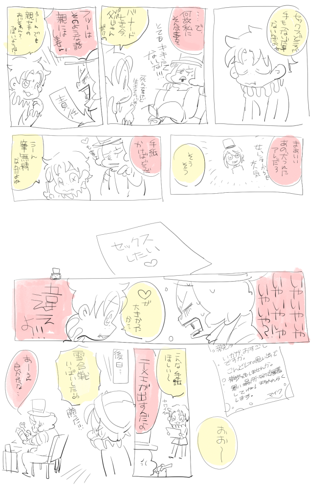 ともし☆quiet followDOODLEビクマイ前提のジョーカーとマイクです(ビクターくんいません)ちょっと下品なギャグです。キャラ崩壊気味注意です。 Tap to full screen (size:667x1000).Repost is prohibited ともしDeep Desire女の子を描きたいが女の子を描きたくなかった後天女体のがすきなんですが(なんかしらの理由で性別が変わるやつ、そして戻る)当荘園のマ君は気にしそうにないですねどこかの荘園のマ君は気にしたりするんでしょうか描(書)いてください ともしDOODLEキンアマ最近あーってなってどうすりゃいいかわからないみんなこうなって他に移動してくのかな描いててなんだけどマくんを泣かせたくはないのだなあ 2 ともしDOODLEキンアマ、お題より。とっても寒い部屋で描いている。いた。ことばがでてこない。尻に敷く受け 2 ともしDOODLEお題箱よりすっげえ楽しかったです困った人は貴カプを使ってこのお題で練習だ!!とも宅ビクマイのせっせは、お願い、抱いてと余裕のない受けに誘われて、攻めの家でします。舌を絡め、混ざりあった唾液を受けが嚥下する様子にとても興奮します。事後、お風呂に向かおうと立ち上がるとナカから攻めの出した白濁…https://shindanmaker.com/978451 2 ともしDOODLE計2枚ラフがすすまんからいや見たい物を描いた2枚目と描きたいものを描いた3枚目(衣装キャラcpあり) 3 ともしDOODLE××?俺の隣で寝てるよってテンプレあったよねえ…昔…マイクはそこそこな育ちジョカは孤児かなんかでサーカス入りしたんではとか勝手に思い込んでるウエハースの囚人ジョーカーの裏に書いてあったのが新人のオイラには初めて見た情報だったのでへえ〜ってかんじだったけどもしかしたらマイクのもなのかなわからん当たらんからな!!! 2 recommended works mikeTIREDアンドルーとビクター描いてーって言われたので描いた れいとちゃんDOODLE #第五人格 #荘園ハロウィン #ポストマン #泣き虫 #ビクター #ロビー LOVEvictorgranzDOODLE探配ノトビクちゃん🧲📮荷物もってるビクターくんにセクハラ、、じゃなく普通に持ってあげるノートンくん落書き#ひしょひしょひしょ #第五人格 #ビクター・グランツ #探配 #ポストマン #ノトビク #第五 #第5人格 #identityV #ビクター #ノートン#探配#ノトビク 2 LOVEvictorgranzDOODLE鬼イソビクちゃん雷こわくて震える落書き:(´◦ω◦`):#ひしょひしょひしょ 2 LOVEvictorgranzDOODLEビクター君とウィックの落書き🔥#ひしょひしょひしょ 2 LOVEvictorgranzDOODLEヴァイ配ちゃん落書き(T_T)#ひしょひしょひしょ#ヴァイ配 4 LOVEvictorgranzDOODLE鬼納配ちゃん落書き(テス)#ひしょひしょひしょ#納配#イソビク 2 LOVEvictorgranzDOODLE探配落書き🧲📮夏祭り、、多分、、きっと#ひしょひしょひしょ#探配#ノトビク 3 ともしDOODLEマジ仕方ないなあ と 陽キャ勘弁 2