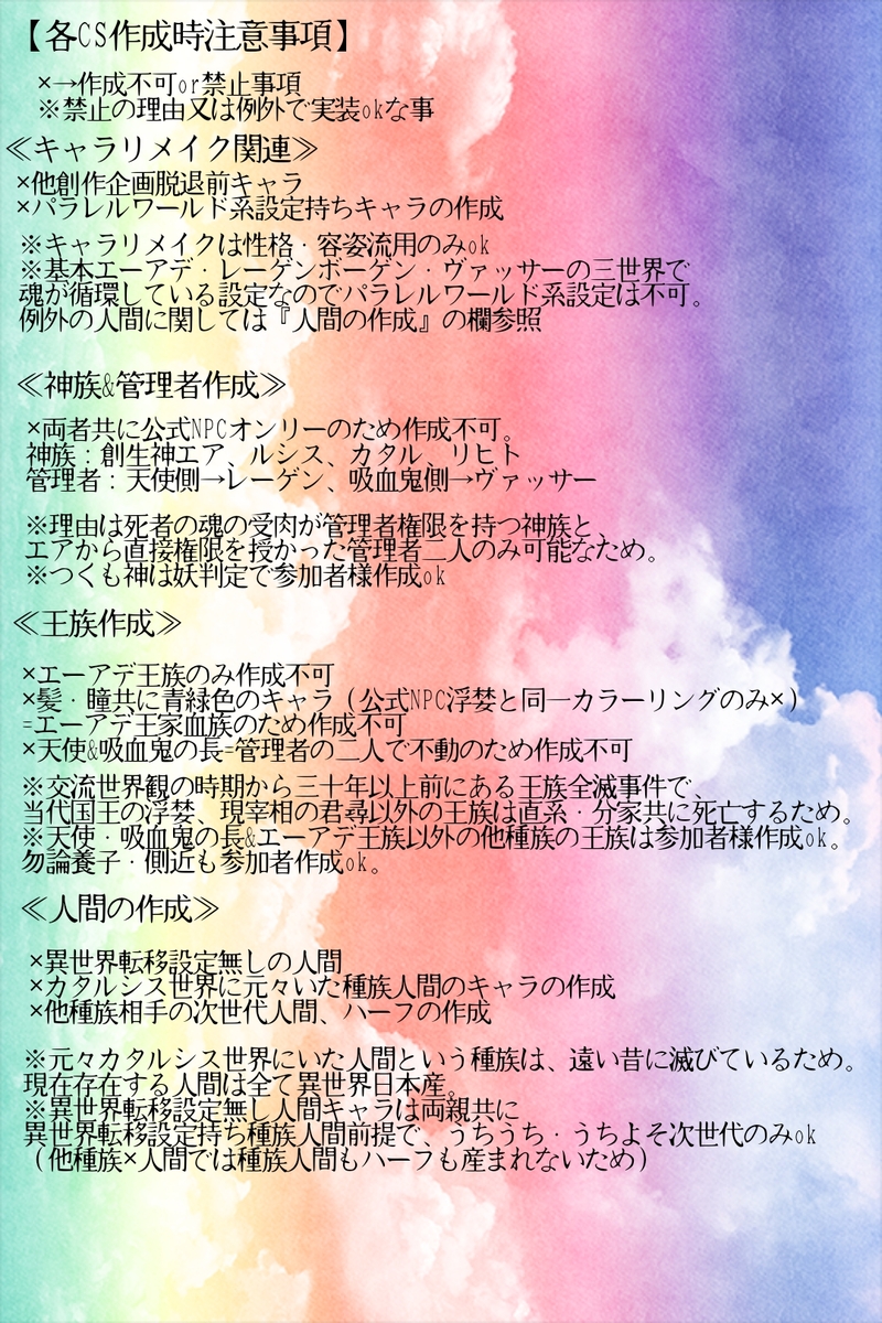 【Katharsis】+【緋葉】☆quiet followINFO【企画Katharsis】CS作成時注意事項(Q&A) #Katharsis_公式 katharsis_formula show all(+2 images) Tap to full screen (size:1080x1621).Repost is prohibited Let's send reactions! freqpopularsnackothersPayment processing Replies from the creator Follow creator you care about!☆quiet follow 【Katharsis】+【緋葉】INFO【企画Katharsis】三大公式スキル 2 【Katharsis】+【緋葉】INFO【企画Katharsis】First season 学園編 追加要素① 2 【Katharsis】+【緋葉】INFO【企画Katharsis】カタルシス世界の属性 2 【Katharsis】+【緋葉】INFO【企画Katharsis】作成可能種族各詳細&寿命 14 【Katharsis】+【緋葉】INFO【企画Katharsis】キャラメイク用簡易設定集 5 【Katharsis】+【緋葉】INFO【企画Katharsis】CS作成時注意事項(Q&A) 3 related works 【Katharsis】+【緋葉】INFO【企画Katharsis】First season 学園編 追加要素① 2 【Katharsis】+【緋葉】INFO【企画Katharsis】カタルシス世界の属性 2 【Katharsis】+【緋葉】INFO【企画Katharsis】企画概要関連&CS記載必須事項関連 8 【Katharsis】+【緋葉】INFO【企画Katharsis】CS作成時注意事項(Q&A) 3 【Katharsis】+【緋葉】INFO【企画Katharsis】三大公式スキル 2 【Katharsis】+【緋葉】INFO【企画Katharsis】作成可能種族各詳細&寿命 14 【Katharsis】+【緋葉】INFO【企画Katharsis】キャラメイク用簡易設定集 5 【Katharsis】+【緋葉】INFO【企画Katharsis】予告版 3