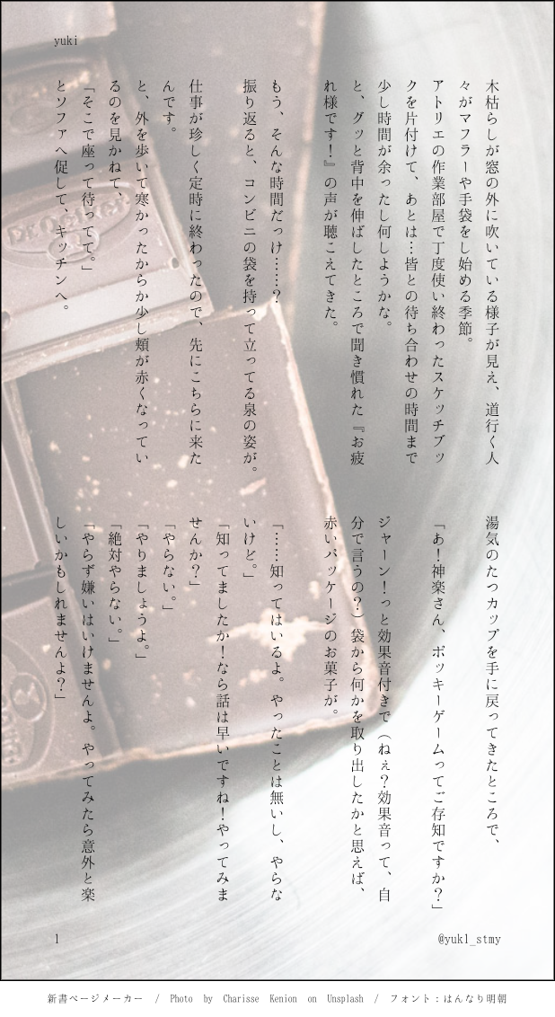 yuk1_stmy☆quiet followDONE◆ログ《2021/11/11》ぽっきーの日に書いたもの。神玲ちゃん🙌 show all(+2 images) Tap to full screen (size:618x1132).Repost is prohibited Let's send reactions! freqpopularsnackothersPayment processing Replies from the creator Follow creator you care about!☆quiet follow yuk1_stmyMENU11/3 ラヴコレ お品書き/大きい画像です 23 yuk1_stmyMENU7/17 エア♥コレのおしながきです。 22 yuk1_stmyDONE◆ついったーに上げるの忘れてました。お題ったーで、出たセリフで書いた潔玲ちゃんです🙌 2 yuk1_stmyDONE◆ログ《2021/11/11》ぽっきーの日に書いたもの。神玲ちゃん🙌 3 yuk1_stmyDONE◆ログ《2021/9》# stmy_FL企画 に参加させて頂いた時の潔玲ちゃんです。生まれて初めて書いたSSなので、お手柔らかに見て頂けると嬉しいです(*´꒳`*) 5 yuk1_stmyValentineエア♡コレ2022 バレンタインカード神玲です。 4 recommended works 空雨KoradianceDOODLE世界树x多托雷 多托雷烧树不成反被x 触手play作恶多端的鲨鱼终被制裁 poniponipoipu3DONEイトバニ🔦🔥ちょっとスケベ 2 QQ_910_DOODLE322破壊と創造の幾何学模様 しゆきMOURNINGいい冒頭全く思いつかなかったので供養。みなせ〜書いてます 書いてます 2 枚原麦子DOODLE1月1日のワンドロお題花、おはようございます、三人旅の日常105分かかりました。もはやワンドロとは一体…という感じで申し訳ないなぁIF?追加。フォロワーさんが結婚しようっていうからつい落書きをしました。 11 墨をはくねこDONE海兵兄弟の海軍入隊時のお話。弟は兄貴を追っかける形で入隊してたら良い…。 3 G0mataniDONE初!牛五です~~!!! matsuneoDOODLE _zwei_zweiSPOILER特にネタバレはないんですけど一応ワンクッション私がわなびー回す時にやってる部屋の拘りなんですけど各陣のお店名、看板メニュー、お店に置いてる植物を聞いて反映させてます次で10陣目になりますので、今までの陣の部屋をここに載せておこうかなと…pass:y 9