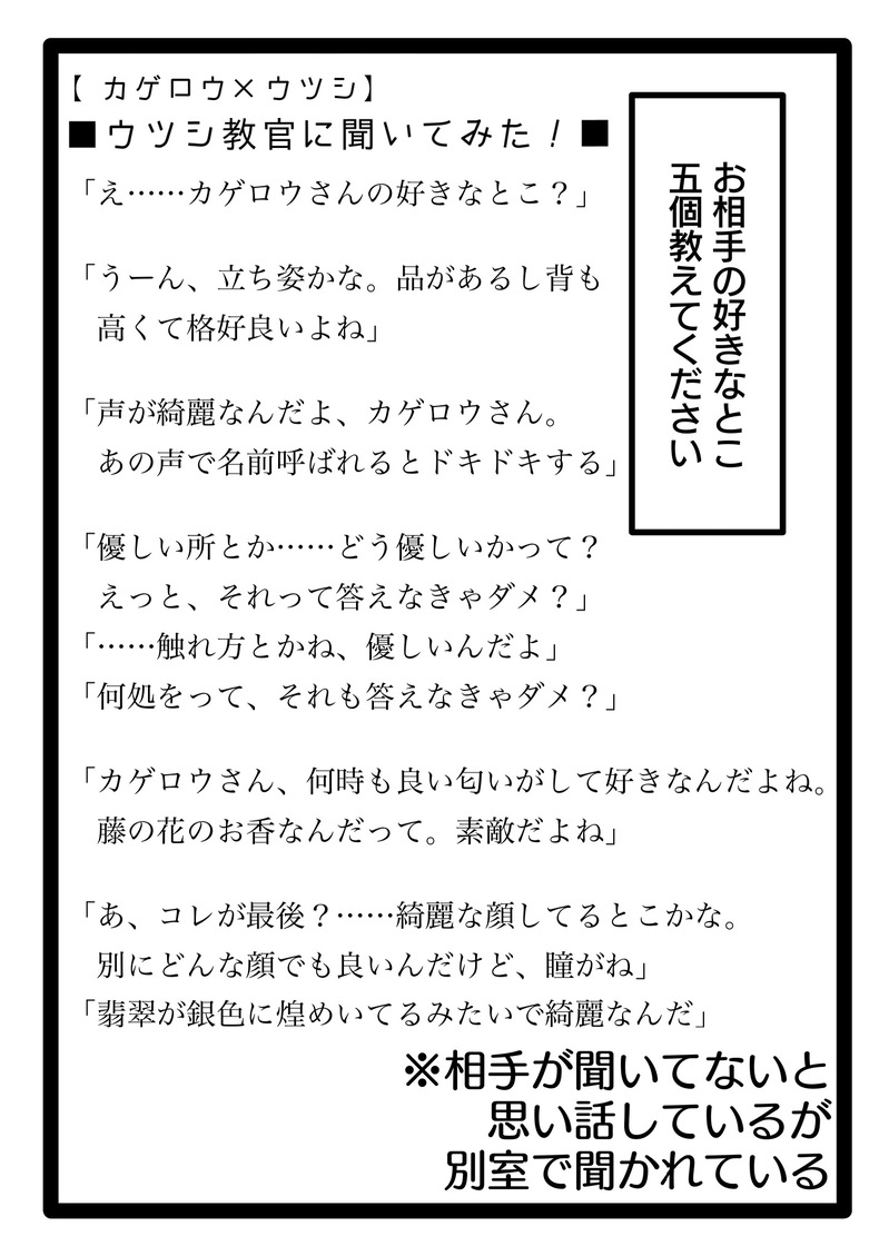 CELI @c371_ILEc *** Twitterにあげたものをポイポイしていくと思います。万人受けするものはあんま書けないと思うので、色々すみません…_:(´ཀ`」 ∠): *** カゲロウさんとウツシ教官が一緒にいる世界線が見たかっただけの人。感想とか貰うと死ぬほど喜ぶぐらい自信がない人間です…_:(´ཀ`」 ∠): ☆quiet follow Yell with Emoji POIPOI 75