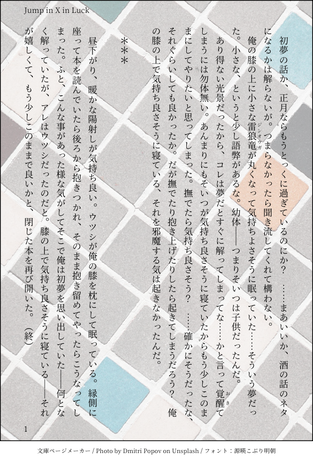 CELI☆quiet followDONEこちらも上げ忘れていた初夢ネタ(カガミ版)カガミは夢の中でも「これは夢だな」とすぐに解りそうな気がします。気が付いた上でその世界を楽しんでそうだなと。 #カガウツ Tap to full screen (size:630x928).Repost is prohibited Let's send reactions! freqpopularsnackothersPayment processing Replies from the creator Follow creator you care about!☆quiet follow CELIDONE「禁足地だからな、不思議な事の一つや二つ、起こるさ」という事で「怖い話」で書いたもの。怖くないって言ってますけど怖かったんだと思いますが、内心、ちょっとヴェルナーは嬉しかったのかもしれません。 CELIDONE以前「怖い話」というネタになった時に思いついた話の内の一つ。怖いというより不思議な話。「禁足地だからな、不思議な事の一つや二つ、起こるさ」というヴェルナーさんの話。ヴェルホルンです。 6 CELIDONEヴェルナーさんとハンターさん、第3回目。グラスの詳細な描写は控えております。「小さいグラス」ぐらいの制限です、なので頭の中に浮かんだソレがヴェルナーが作ったものです。よろしくお願いします。 6 CELIDONEヴェルナーさんとハンターさん、第2回目。交わりの祭事の大集会所でこういう幻覚を見たので…「龍灯へのアプローチを変える」と言ってたのでこの後「どうだ、懐かしいだろ?」と言って桜を持っていくんだと思います。 2 CELIDONEヴェルナーさんとハンターさん、第1回目。こういう話があったらいいなを妄想。ヴェルナーはマシュマロを焼く時もゴーグルかけてそうだなーと。 2 CELIPAST2024年3月に参加したAC6アンソロジー、フロイト死に様合同『Todestrieb』(https://palebraze.booth.pm/items/5956263)に寄稿したやつです。スネフロ未満で未遂。火√でフロイトが死ぬまでにこういうやりとりが何処かにあったらいいな、という妄想です。 10 related works CELIDONETwitterの方で上げていた傷の手当てをするカガウツの話です。*** ソラネさんは母であり師であり教官だったと思うと、息子のウツシは時々複雑だったんじゃないのかなという妄想です。 CELIDONEカガウツ朝食ネタ4回目。深夜にケーキを焼くアレを思い浮かべながら書いたもの。「懐かしい未来」は岩本版ロックマンXに出てくる言葉です。良い言葉が多いんですよね、あの漫画。ちなみにベーキングパウダーは省いてますが絶対に入れた方が良いです… 2 CELIDONEすっかり上げ忘れていた「ウツシの装備をしたカガミ、カガミの装備をしたウツシ」という話です。実際に見せて貰った時に思いついたもの。不思議な事に何かしっくりこない、あの不思議な感じは何でなんでしょうね… CELIDONE「麻酔明けのカガミが陛下の演説を聞き忘れて見舞いに訪れたウツシ教官が声真似をする」という実体験を元にしたネタ。カガウツ未満、塩味。 5 CELIDONE今更ですが初夢ネタ(教官版)、これも上げ忘れです。カガミは氷狼竜のイメージが強いのですが、今年は辰年だったのもあって「白銀の龍」になって頂きました。 CELIDONE「インセクト」(松本零士)の蓑虫の話を思い出してたら降ってきたカガウツ。一部少し参考にしつつ書いたモノ。クソ暗い、エロくない、そこそこエグい、描写はないがモブとやってる、コレは酷い…そんな話です(念のためR18) 6 CELIDONEカガウツ朝ごはんネタの3回目。何だかんだで米と味噌って恋しくなると思うんですよ。でも海外旅行でインスタント味噌汁を大量に持ち込むのは賛否あるかもしれません…という海外経験を思い出してました。 2 CELIDONE過ぎ去った「バニーの日」を思い浮かべたら出てきたネタ。通勤時間の合間に書き出したら説明文みたいになった、カガウツ描写少なめの何か。食べる行為って本当はエロいなぁと思ってます。 2 CELIDONE狩猟音楽祭で浮かんだカガウツのネタ。多分、付き合っている二人。あと「開演の音」は先日Twitterに流れてきたアレです。 2