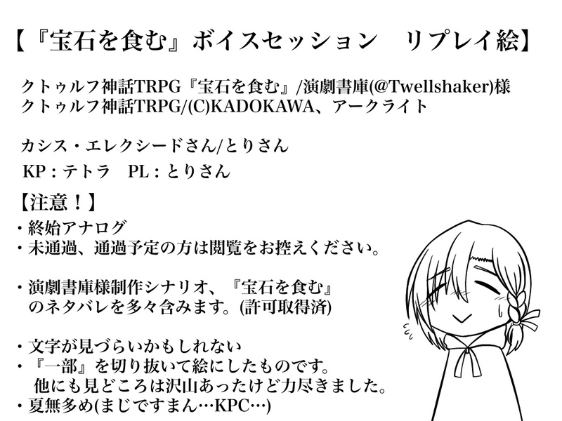 テトラの遊び場☆quiet followDOODLE【クトゥルフ神話TRPG『宝石を食む』ボイスセッション リプレイ絵】⚠️演劇書庫(@Twellshaker)様制作シナリオ『宝石を食む』のネタバレが含まれます(許可取得済)未通過・通過済以外の方で大丈夫であれば『ok』 show hide show all(+6 images) Tap to full screen (size:1024x768).Repost is prohibited Let's send reactions! freqpopularsnackothersPayment processing Replies from the creator Follow creator you care about!☆quiet follow テトラの遊び場DOODLE【注意】・雲音様制作 クトゥルフ神話TRPG『全てを捨ててでも救いたいもの』のネタバレ・狂気・途中力尽きて落書き・もしかしたら更新するかもしれない10/30のボイスセッションのリプレイです。ソラ様宅の莪蒁 葎さんと複数お借りしました。 9 テトラの遊び場DONE西園寺修也が『大切な誰か』に再会できるまで 1672 テトラの遊び場SPOILER【注意】クトゥルフ神話TRPG『全てを捨てでも救いたいもの』のネタバレが含まれます。泡雪祷の後日談とKPの配信で語りあったIFルートまとめです。ソラ様の莪蒁葎さんお借りしました。 4066 テトラの遊び場DOODLEパスワード : 某配信の日にち【注意】集合体(文字)・狂気 テトラの遊び場DOODLE 1543 テトラの遊び場DOODLE【クトゥルフ神話TRPG『宝石を食む』ボイスセッション リプレイ絵】⚠️演劇書庫(@Twellshaker)様制作シナリオ『宝石を食む』のネタバレが含まれます(許可取得済)未通過・通過済以外の方で大丈夫であれば『ok』 7