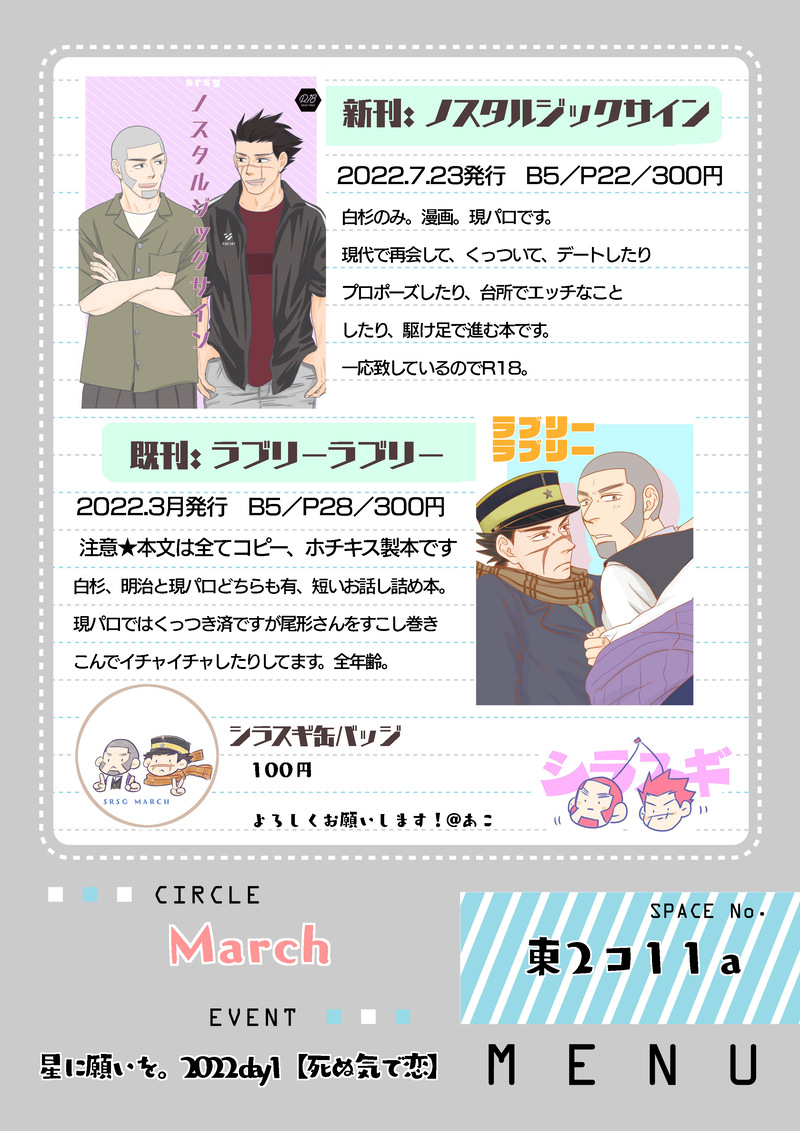 7.23星に願いを。1days.杉元受オンリー『死ぬ気で恋』内、白杉プチオンリー『俺のかたっぽ靴下ちゃんinSummer』に参加します!!楽しみ!!!!白杉で、自分で直参するのはじめて…✨デジタルで原稿作成・入稿したのもはじめて…(直接搬入なので当日まで見れぬコワイ)デジタル(今年あいぱどエア入手!)なのでお品書きも初作成できました✨白杉のおかげです…✨宜しくお願いします!パス:白杉好きな大人?