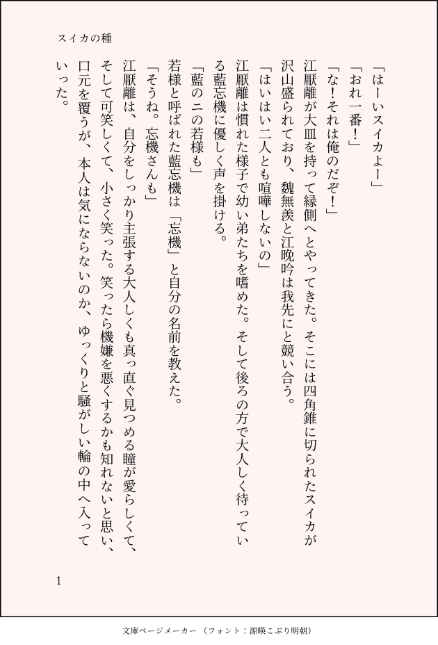 あんとろ☆quiet followMOURNINGスイカを食べて種を飛ばすキッズたちの話魏無羨江晚吟聶懐桑と藍忘機みんな仲良く #魔道祖師 GrandmasterOfDemonicCultivation #魏無羨 WeiWuXian #現代AU modernAu show all(+4 images) Tap to full screen (size:630x928).Repost is prohibited Let's send reactions! freqpopularsnackothersPayment processing Replies from the creator Follow creator you care about!☆quiet follow あんとろDONE「おでけけ~大阪編~」20231117FUAfes※転載禁止・DL禁止 38 あんとろDONE「忘羨の夏休み2/2」20231117FUAfes※転載禁止・DL禁止 6 あんとろDONE「忘羨の夏休み1/2」20231117FUAfes※転載禁止・DL禁止 32 あんとろDONE「おでけけ~江ノ島編~」20231117FUAfes※転載禁止・DL禁止 34 あんとろDONE「店長スペシャル入ります!」20231117RUAfes※転載禁止•DL禁止 11 あんとろDONE「大阪編の大阪土産」20231117RUAfes※転載禁止•DL禁止 3 related works kd1ty4_ko_2MAIKINGNLでも描いたことなかった肌色系、描いてみたいと思わせる魔道祖師(忘羨)、恐るべし笑完成するかどうかは不明😂 西村ルルMOURNING書けないから供養。長い設定つき。現代AU、男子校パロ。魏嬰が藍湛の🍆を口にする描写があるので、R18にしています。乳首触ったとこから進まず、途中放棄してしまいました😂 1804 はゆやSPUR MEオメガバース忘羨匂わせ程度のすけべな描写あり設定はこちらhttps://twitter.com/soushokukoebi/status/1483004515385507840?s=21 2605 九夏BOXPAST毎日一緒に寝てくれるんだろ? やっすーTRAINING魔道祖師の魏嬰ちゃんです! とさみくMAIKING 伊東しんDOODLE魏嬰と金凌が凄く好みです ごーるDOODLE待ちぼうけ⚠︎Attention⚠︎全て個人の妄想によるフィクションです。実在の人物・団体・事象とは一切関係ございません。無断の転載を固くお断りします。It's all an individual fantasy fiction. 藍湛の悪夢。ハピエンです!!阿令設定ですがまどそしでも。痛いほどに、愛しく思う。 9 emi_smile_m__mMAIKING初投稿。 recommended works アルティメット微雨ちゃんDONEワンドロ参加しました~お題は大掃除です。 きょむDONEワンドロ「さくらんぼ」 いそらDOODLEぱぱがすきこどものひ Do not Repost・東龍PAST「ありがとう」 ときめきジャムリアルDOODLEお題「ガンダルヴァ」で歌のおにいさんです···※11月26日 設定のメモ書きみたいなのも描いたので付け足しました✍🏻 2 yuuki_ohtaMAIKING忘羨(下塗り) Do not Repost・東龍DONEお題【ギザ歯】メインキャラの中にギザ歯がいないのでどうしたもんかと考えた結果、小学生の時の人外キャラを擬人化させてみました。スゲェ懐い。 2 ズッ友の李徴MAIKING今週のワンドロ「奪う」「禁言術」ベタ塗りはおあずけ vino13miiDONE結婚した曦澄のオチのないほのぼのした一日です。(一日と言っても朝だけですけど💦) 8