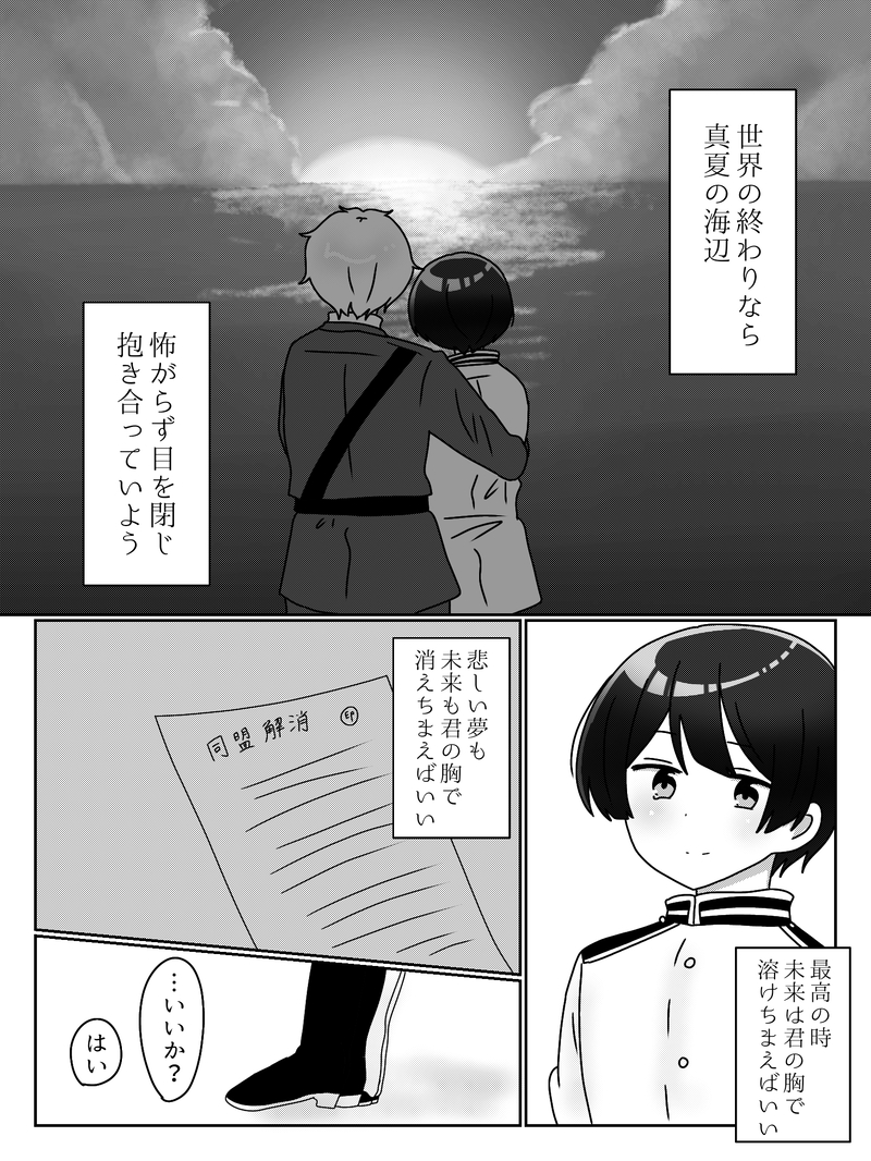 曲の歌詞で朝菊ちゃん(と三次創作)漫画描いてたやーつー。1・2枚目(ナンチャラLOVERって言う曲)、3〜6枚目(MY EYES AND YOUR EYESって言う曲)、7枚目は単体(Opheliaって言う曲三次創作)、8〜13枚目(無限LOOPって言う曲三次創作)、14〜17枚目(FRAMEって言う曲)でセットです。