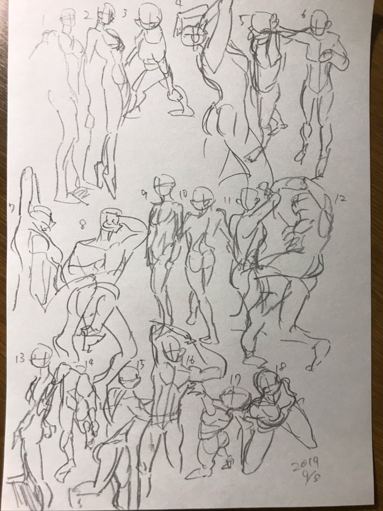 はくとう☆quiet followTRAINING6日目マッチョが1回も出なかった珍しい回。4番目は途中で(自分の)体勢を変え、目と紙との距離が急に空いたためにこうなったようです。・脚と足からなるラインもかなり表情豊かで面白いと感じた。今まではただ地についている足、棒立ちの脚ばかり描いていたように思う #ポーズマニアックス poseManiacs Tap to full screen (size:750x1000).Repost is prohibited Let's send reactions! freqpopularsnackothersPayment processing Replies from the creator Follow creator you care about!☆quiet follow はくとうTRAININGポーズマニアックス30秒ドローイング30日目1ヶ月達成!いつも3日坊主なので嬉しい。反応下さった方ありがとうございました。まとめると文字数の余裕がないからここに書きませんが、色々と発見のあった1ヶ月。 次は精緻な模写などやろうかと考え中。細かい形や構造はまだ分からないところが多いし、大きく描くと崩れるので。 はくとうTRAINING29日目今日はちょっと適当になったかも・手足の仕草が気になる はくとうTRAINING28日目電車が12時をまわっても終電までは増税しないように、こちらも自分が寝るまでは9月30日。・重心を捉えられるようになりたいと思った・肩周りが依然として謎。 はくとうTRAINING27日目・座ってるポーズが難しい。接地面の認識など。・頭はよく丸いアタリで説明されるけど、実際にはそんなまん丸でないなと思った はくとうTRAINING26日目大体立ってるような姿勢だとスッと描けるところも横向きになると描けなかったりするので、まだ先は長いなと感じる。寝る前に滑り込み はくとうTRAINING25日目途中で集中が切れそうになったが持ち堪えた・アオリで描く脚が楽しくて良い・折りたたんだ脚の重なり具合がわかってない related works yukihara135TRAINING11/2(月)~11/6(金)のポーマニ!45秒のやつをついかしてみた 5 はくとうTRAINING11日目眠いながらもやる気はそれなりに・とりあえず全身を描くぞという意識・頭の描き方も少し気をつけてみたり(気をつけてないときもある)最近普通に絵を描くとき、後ろ姿について適当に済ませるのでなくしっかり背中の形をとるようになりました。まだ不恰好だけれども。 綾月@画力強化月間TRAININGポーマニ4日目。 #ポーズマニアックス yukihara135TRAINING10月になったけど相変わらずポーマニ yukihara135TRAINING間あいたけどポーマニ。まだ全然描けてないけど、30秒ポーマニ始めた時と比べると進化してる気がする 2 hntmknTRAINING下着。ポーズマニアックスで練習したもの。デコルテが広すぎた気がする。 yukihara135TRAININGポーマニを10秒に短縮してやってみる。全然時間足りないけどウォーミングアップによさげ 雲津巾TRAINING久しぶりに描いてみた はくとうTRAINING10日目2枚目は初日と並べて比較の図思ったよりは変化があるかも。各パーツの形を少しずつ覚えてきている?・今更だけど女性の素体は胸(脂肪)があるからその辺の筋肉の流れが見にくくて難しい・慣れてきた反面、上手く描こうとして観察する方を怠っている部分があるかも(過去似たようなポーズを描いて記憶しているものが混ざってる気がする)・珍しいポーズは観察しがいがあり新鮮で面白く感じる 2 recommended works 青@気分屋絵描きTRAINING30秒ドローイング前半は無理矢理全部描いたもの後半はできるだけ丁寧に描いたもの#ポーズマニアックス mayuka_chanokaDOODLE謎らくがき 綾月@画力強化月間TRAININGここしばらくろくに描けなくなったので、練習することに。原稿落ちるのマズいから、早く復帰したいですね(´・ω・`) 綾月@画力強化月間TRAINING今日もポーズマニアックスを。ちょっと描ききれなかったポーズも_(:3」∠)_*マイペースに描けるようツイッターをお休み中です。DMやリプは気付くようにしてますが。調子が戻るか、入り浸りたい衝動に掛られたら戻ります。 はくとうTRAINING3日目。今回は60秒でも挑戦30秒・手足の細かい形は時間ないので別で練習したい・アオリ俯瞰だと隠れる部分や見えてくる部分が思った以上にあると感じた60秒・観察する時間が取れる分細かい発見がある・集中が切れそうになるこうして並べると、30秒の方が全体の印象を捉えようとしていて60秒は筋肉の線に目が行っているらしいのがわかる 2 はくとうTRAINING12日目・頭の形、耳の位置に注目した・細部が気になるポーズはそこに注目してあとは適当だったり終わらなかったり・俯瞰での肩が苦手2枚目は回転モデルONで60秒ドローイングをやろうとしてギブした残骸と、1つのポーズを5つのアングルから描いた図もっとカッチリ練習した方がいいかと思いつつ、あんまり大変だと続かないので、ある程度適当さも許容して続けたいですね。 2 はくとうTRAINING13日目・もう少し観察する時間が欲しいと思った・引き続き頭の形には少し気をつけた はくとうTRAINING20日目親指は回復傾向にある・背骨とその左右の筋肉が気になる・細部を写して全体のバランスが悪くなりがち身体の流れを無視しないようにしたい関係ないけど、こうして見ていると臀部〜大腿の筋肉は身体の中でもかなり