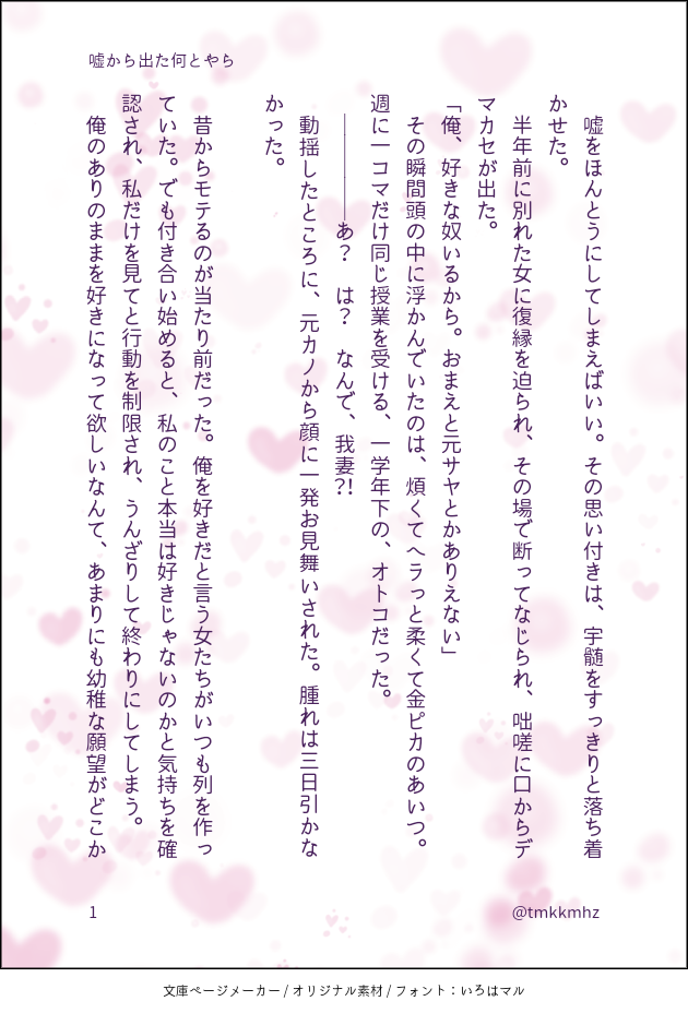 tomoko☆quiet followTRAINING2023年12月1日 お題で書こう30日間特訓 11日目『嘘から出た何とやら』〔書き出し〕嘘をほんとうにしよう。〔文末〕新しい名で呼ぶと、弾かれたように振り返った。 show all(+5 images) Tap to full screen (size:630x928).Repost is prohibited Let's send reactions! freqpopularsnackothersPayment processing Replies from the creator Follow creator you care about!☆quiet follow tomokoDONE公然の秘密3、開催おめでとうございます。書けたところまで、またしても書きなぐりのそのままです。2月に本にできるといいなと思っています。パスワード外しました。表紙は同人誌表紙メーカー様よりお借りしています。これまでのお話は、 https://poipiku.com/3560528/11369155.html です。 19 tomokoMEMO『まるごとの愛』を書き始めた時のメモ。アプリにプロットやらいろいろ入れたけど、結局手書きしてやっとまとまったのを思い出した。過去の私に今の私のSiriを叩いて欲しくてアップ。 2 tomokoDONE公然の秘密2、開催おめでとうございます。途中まで、しかも書きなぐりのそのままですが、こんなお話を書こうとしています。表紙は同人誌表紙メーカー様よりお借りしました。▼▼▼▼▼▼▼▼▼▼▼▼▼▼▼宇善WEBオンリー「公然の秘密3」で続きを公開しました。https://poipiku.com/3560528/12226538.html 15 tomokoPROGRESS 2 tomokoTRAINING2023年11月21日から12月22日まで、「お題で書こう30日間特訓」完走しました。 3 tomokoTRAINING2023年12月22日 お題で書こう30日間特訓 30日目『幸せの音』〔書き出し〕鍵のかかった抽斗。〔文末〕ベランダには仲良く色違いのサンダルが二足並んでいる。 6 recommended works にわさんDOODLE遊郭編 善子 口紅忘れた…チーン二枚目は指◯ェラしてるのでお気をつけて… 3 スタンプいっぱい欲しいDONEありがとうマシュまろ l_rabbit426DOODLEキメ学宇善 n番煎じのおててネタ l_rabbit426DOODLEこういう時こそ、ド派手に泣け tobitakehikoDOODLEおつきみ宇善🐰🌝🍡拉致するうずいてんげんとうさぎの可能性を理解したうずいてんげん 2 p_tan0812DONE花粉症で乳首が痒くなってしまう善i逸の話全18P宇善⚠️R18です。高卒済みの成人の方のみお読みください。⚠️倫理観ありません。なんでも許せる方むけ。パスワードの質問成人済みですか?yes/no 18 miyaMOURNINGやじるしの向き② 4 饿狐💗DOODLE分头 2 Ayuuu522DONE宇善背後注意ですが全然えろくなくてすみません🙇♀️