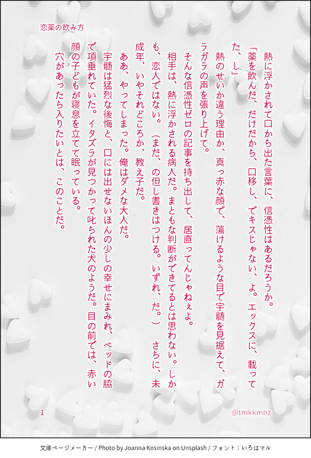 tomoko☆quiet followTRAINING2023年12月8日 お題で書こう30日間特訓 18日目『恋薬の飲み方』〔書き出し〕熱に浮かされて口走ったことに、信憑性はあるだろうか。〔文末〕「その代わり、寿司でも奢ってくださいよ」 show all(+10 images) Tap to full screen (size:630x928).Repost is prohibited Let's send reactions! freqpopularsnackothersPayment processing Replies from the creator Follow creator you care about!☆quiet follow tomokoDONE公然の秘密3、開催おめでとうございます。書けたところまで、またしても書きなぐりのそのままです。2月に本にできるといいなと思っています。パスワード外しました。表紙は同人誌表紙メーカー様よりお借りしています。これまでのお話は、 https://poipiku.com/3560528/11369155.html です。 19 tomokoMEMO『まるごとの愛』を書き始めた時のメモ。アプリにプロットやらいろいろ入れたけど、結局手書きしてやっとまとまったのを思い出した。過去の私に今の私のSiriを叩いて欲しくてアップ。 2 tomokoDONE公然の秘密2、開催おめでとうございます。途中まで、しかも書きなぐりのそのままですが、こんなお話を書こうとしています。表紙は同人誌表紙メーカー様よりお借りしました。▼▼▼▼▼▼▼▼▼▼▼▼▼▼▼宇善WEBオンリー「公然の秘密3」で続きを公開しました。https://poipiku.com/3560528/12226538.html 15 tomokoPROGRESS 2 tomokoTRAINING2023年11月21日から12月22日まで、「お題で書こう30日間特訓」完走しました。 3 tomokoTRAINING2023年12月22日 お題で書こう30日間特訓 30日目『幸せの音』〔書き出し〕鍵のかかった抽斗。〔文末〕ベランダには仲良く色違いのサンダルが二足並んでいる。 6 recommended works !じぷ!PAST昔描いてた宇善2 2 AgatsumaRaineDONEKINKY UZENTOBER 2021 DAY 3 : Vessel + Sounding AgatsumaRaineDONEKINKY UZENTOBER 2021 DAY 19 : EXTINCT X HAIR PULLING AgatsumaRaineDONEKINKY UZENTOBER 2021 DAY 21 : PATCH X GAGDAY 22 : LEAK X LACTATIONDAY 23 : COMPASS X BALLBUSTINGDAY 24 : FUZZY X RIMMINGDAY 25 : PICK X ICEDAY 26 : STUCK X ROPEDAY 27 : SPARK X THIGH HUMPING 7 lab2i36osDONE「相互相愛」おまけページ。二人の裏垢つみ~と公開編です!パスワードは10/16発行の新刊「相互相愛」のあとがきページに記載しております。 14 みるくDONE10/8 宇善WEBオンリー「公然の秘密」開催に合わせて期間限定で公開いたします。パスワードは展示ページの説明欄に記載。(小説の奥付のものと異なります)---6/25 もうぜんぶ、JB2023こちらに参加させていただきました。ありがとうございました!頒布した『忘れ雪(漫画)』の全編です。(最初の10ページは公開済のものと同じです)パスは小説の奥付をご確認ください🙇♀️ 28 にやのDONE衣替えしてる宇善 nokibi_akiDONE頼もしい隣人。奥様初心者ですから。 4 パイナップルDOODLE