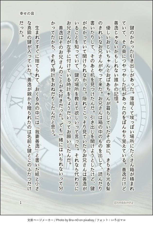 tomoko☆quiet followTRAINING2023年12月22日 お題で書こう30日間特訓 30日目『幸せの音』〔書き出し〕鍵のかかった抽斗。〔文末〕ベランダには仲良く色違いのサンダルが二足並んでいる。 show all(+5 images) Tap to full screen (size:630x928).Repost is prohibited Let's send reactions! freqpopularsnackothersPayment processing Replies from the creator Follow creator you care about!☆quiet follow tomokoDONE公然の秘密3、開催おめでとうございます。書けたところまで、またしても書きなぐりのそのままです。2月に本にできるといいなと思っています。パスワード外しました。表紙は同人誌表紙メーカー様よりお借りしています。これまでのお話は、 https://poipiku.com/3560528/11369155.html です。 19 tomokoMEMO『まるごとの愛』を書き始めた時のメモ。アプリにプロットやらいろいろ入れたけど、結局手書きしてやっとまとまったのを思い出した。過去の私に今の私のSiriを叩いて欲しくてアップ。 2 tomokoDONE公然の秘密2、開催おめでとうございます。途中まで、しかも書きなぐりのそのままですが、こんなお話を書こうとしています。表紙は同人誌表紙メーカー様よりお借りしました。▼▼▼▼▼▼▼▼▼▼▼▼▼▼▼宇善WEBオンリー「公然の秘密3」で続きを公開しました。https://poipiku.com/3560528/12226538.html 15 tomokoPROGRESS 2 tomokoTRAINING2023年11月21日から12月22日まで、「お題で書こう30日間特訓」完走しました。 3 tomokoTRAINING2023年12月22日 お題で書こう30日間特訓 30日目『幸せの音』〔書き出し〕鍵のかかった抽斗。〔文末〕ベランダには仲良く色違いのサンダルが二足並んでいる。 6