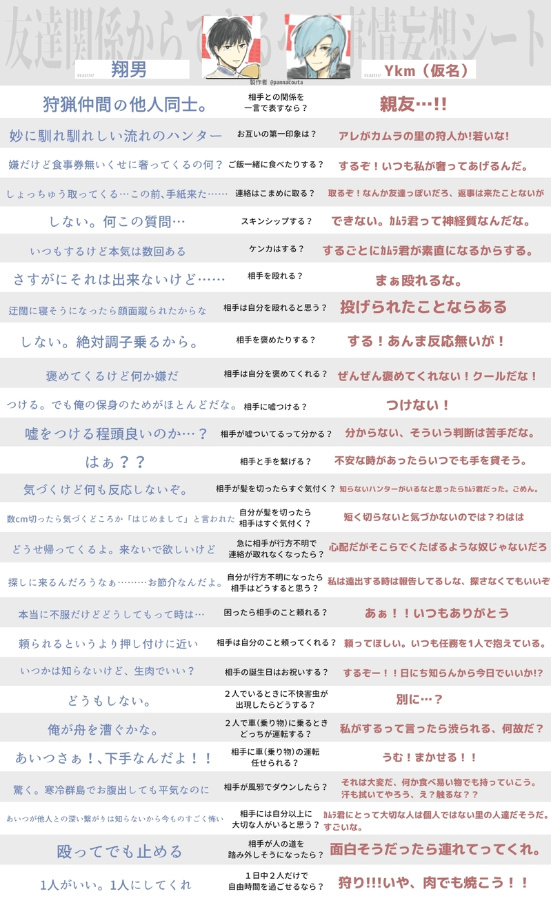 bee_176☆quiet followDONE友達関係シートに自ハンをぶち込みました、楽しい show all(+1 images) Tap to full screen (size:1300x2140).Repost is prohibited Let's send reactions! freqpopularsnackothersPayment processing Replies from the creator Follow creator you care about!☆quiet follow bee_176PAST自ハンまとめです!!今回から、ぬい君がいっぱいです青空垢の方であげてたりした落描きもまとめて置きます 25 bee_176DONEオリハンひゃっほう【2】に展示してました弊ハンター2人のギャグ系漫画です突然シリアスな展開があります(2025.2.22) 27 bee_176DONEキャラクターシート(テンプレお借りしました)おかわりひゃっほうに向けて更新したキャラシです 2 bee_176DONE友達関係シートに自ハンをぶち込みました、楽しい 2 bee_176DOODLEほぼ1年ぶりに描いてきたもののまとめです仲のいい自ハンもあって微笑ましいですね 19 bee_176DOODLE去年10月から描いてた落書きをまとめました!下にいくにつれて自ハンが辛そうだったり可愛かったり 15