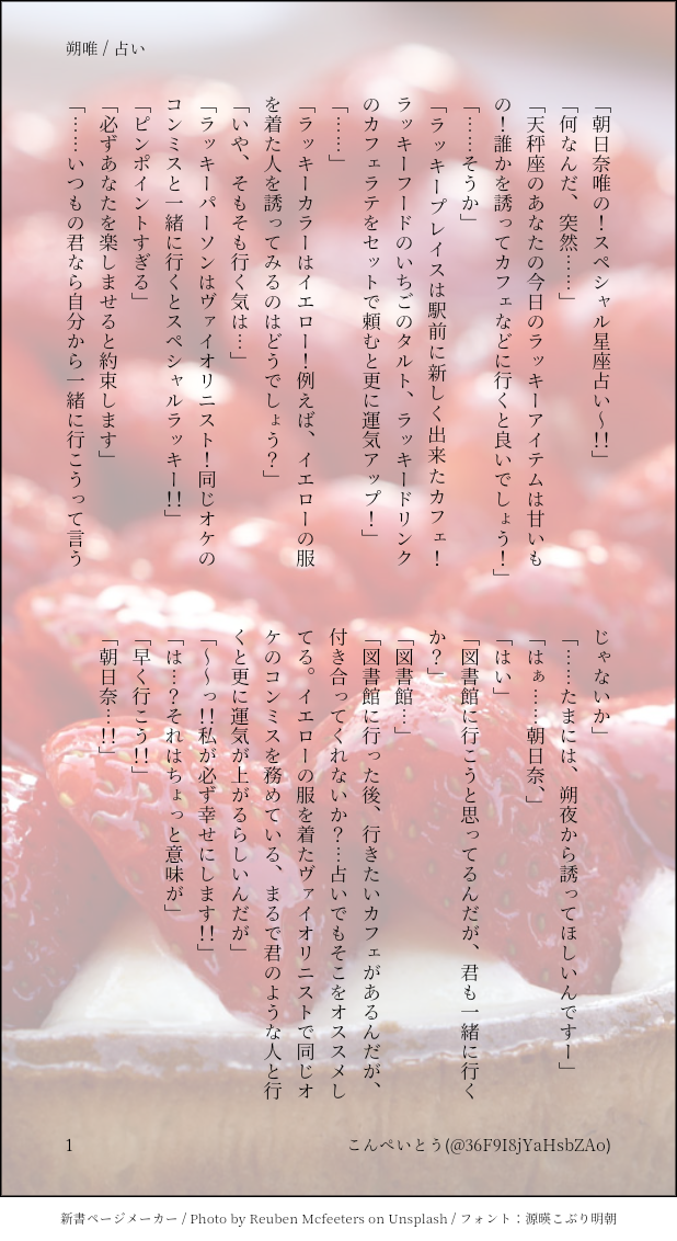 こんぺいとう☆quiet followDONE朔唯 : 占い(?) #スタオケ #朔唯 sowei #星明かり2 Tap to full screen (size:618x1132).Repost is prohibited Let's send reactions! freqpopularsnackothersPayment processing Replies from the creator Follow creator you care about!☆quiet follow こんぺいとうDONE朔唯 : 君の目大したことない(直接的な表現なし)ですが、雰囲気がちょっと…なので、一応ワンクッションですたまにはこういうのも、ね 561 こんぺいとうDOODLE朔唯 : ……君と……君と二人なら※ 朔夜カドストネタバレあり式後の二人昔もらったブーケに、もう一度誓う話朔唯Webオンリー時のネップリ再掲 2557 こんぺいとうDONE朔唯 : 占い(?) こんぺいとうDONE待つ / 七唯(※七瀬18歳設定)・浮唯 2 こんぺいとうDONE逃げられない / 流唯・凛唯・笹唯 3 こんぺいとうDONE三唯 : 「俺はコンミスが悪いと思う」「~~~っ、なんで竜崎まで知ってるんだよ!!」蒼色の五線譜、開催おめでとうございます✨短い上に会話のみですが、楽しんでいただけたら幸いです💕一応、続きを考えているので、明日間に合えばいいな…!!2023/09/23 443 related works amururunkoDONE浮唯です。付き合っていませんが、浮葉にとって唯は最初からかなり特別な人間だったろうと思います。華やいで絢爛、開催おめでとうございます!! 10 はな-hana-DONE7月31日は『🎵蓄音機の日🎵』成宮くんと唯ちゃん。蓄音機と喫茶店いいな〜というのと、喫茶店にエプロンの成宮くんを見たくて😊レコードとかも詳しそうな気がする〜🥳 skyapricotSPOILER【スタオケ】メイン3章や朔夜SSRカードストやデートストバレ有 枢木ひかりDOODLE kanra_e1ghtDOODLE成唯 ともそDOODLE三上蒼司くん スズマルDOODLE怜唯を探せ Nightingale0616MEMO【巽瑛一に理性を吹っ飛ばされた当方の雑記】懐かしいのでUPしてみました。はしゃいでいるようですが、その後4話を読んでショックで寝込みます。笑初出・20220324(初開催マドリガル最終日) 3 ramnim らむDOODLE常陽サンド(*´༥`*)ウマウマ recommended works ramnim らむDOODLE待ってだよ、朝比奈さん ななおDONE三上君誕生日絵と浮葉様誕生日絵。二人共雰囲気的に水彩っぽいの合ってると思ったのでそんな感じに塗っちゃいました。男キャラ描き慣れてないので少しずつ描けるようにしたいですね… 2 sutaokedumeMEMO過去ログ②三唯 14 紫垣🐠DONEVDホムボを言う朔夜くんの話VDホムボどんなシチュエーションで言ったのかな…と思って何パターンか考えたうちのひとつです…! 3 ほっこりトミイDOODLEホワイトデー復刻はジュエルが沢山もらえて良いイベントでした!まぁ瞬時に月城で消えましたけど。 ティアナDONE花あかり~後編~スタオケ疾唯、R-18 2151 紫垣🐠DONEスタオケ/朔唯 写真の話12/15 エアコレで新刊をお申込みいただいた方に先着でおまけにお付けしていたものです。 akinokosameDONE一之瀬銀河×朝日奈唯。R18。ただマエ展示作品。パスワードは「18歳以上ですか?」の質問にyesかnoでお答えください。アホでエロでハッピーなお話を目指しました!在学中、ふたりが晴れて(?)結婚するお話です。オケメン全員が出てるので、他の自推しの前で、銀河くんと唯ちゃんが結ばれるのを見たくない方はご注意ください。フォロイさんに、「銀唯」「在学中」「〇〇し」という難題をだされて、いかにふたりが合法にいちゃつける時空にするかに腐心して、こうなりました…。ふたりがじつは結婚しているが公然の秘密という設定はフォロイさんに捧げたフリー素材ですので、よろしければどうぞお好きなように調理していただきたいです。大手をふっていちゃつく銀唯がもっと見たい…!! 9505 すふれDOODLEはじめてかいた慧様+おまけ唯さん