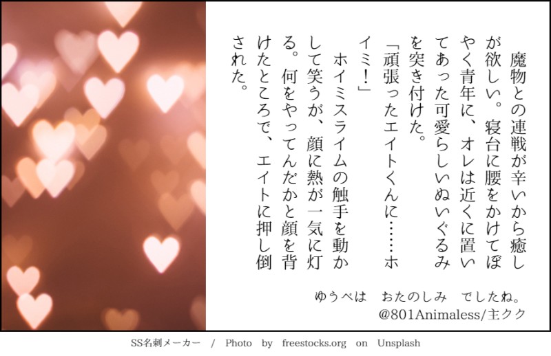 801Animaless☆quiet followDONE貴方は松村の899で『「癒しが欲しい」「俺とかどう?」』をお題にして140文字SSを書いてください。https://shindanmaker.com/587150(よぉわからんものを作った自覚はあるのだ) Tap to full screen (size:910x590).Repost is prohibited 801AnimalessDONE主ククのお話は「結婚したんだ」という台詞で始まり「暖かで優しい感情を貴方が教えてくれた」で終わります。# こんなお話いかがですか # shindanmakerhttps://shindanmaker.com/804548 801AnimalessDONE松村の主99のお話は「人は本当に悲しいとき、涙が出ないのだと知った」で始まり「本当に嬉しいとき、言葉よりも涙が出るのだと知った」で終わります。# こんなお話いかがですか # shindanmakerhttps://shindanmaker.com/804548 801AnimalessDONE松村の主ククのお話は「名前も知らないその人に、ひと目で惹かれてしまった」で始まり「また会えますようにと願うほかないのだ」で終わります。# こんなお話いかがですか # shindanmaker 801AnimalessDONE今夜の幸せ語りに、「恋人とお出かけするからちょっとだけ気合い入れた松村の主クク」は如何でしょう?# あわよくばもっと幸せになれ # shindanmakerhttps://shindanmaker.com/772259 801AnimalessDONE貴方は松村の899で『「癒しが欲しい」「俺とかどう?」』をお題にして140文字SSを書いてください。https://shindanmaker.com/587150(よぉわからんものを作った自覚はあるのだ) 801AnimalessDONENEXT(多分)→今日の松村の主クク最近寒くて寝付きが悪いと言ったら寝る前にホットミルクを作ってくれた。安心する味がする。今日はいい夢見られるかも。https://shindanmaker.com/831289
