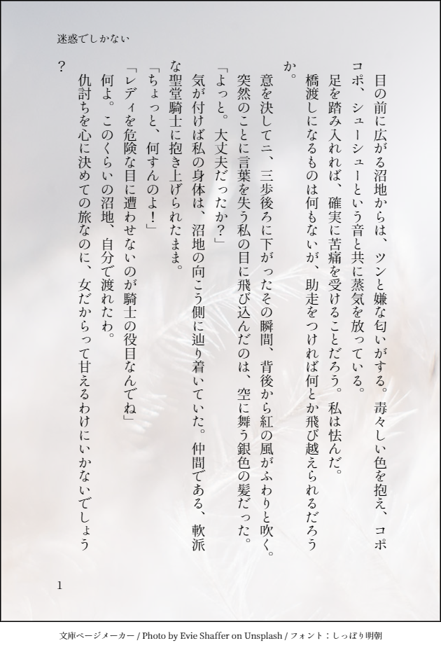 shirokumayuta☆quiet followPASTククゼシの『迷惑でしかない』という台詞を使った「甘い場面」を作ってみましょう。#serif_odaihttps://shindanmaker.com/74923 #診断メーカー diagnosticsMaker show all(+1 images) Tap to full screen (size:630x928).Repost is prohibited Let's send reactions! freqpopularsnackothersPayment processing Replies from the creator Follow creator you care about!☆quiet follow shirokumayutaDONE主姫折り本ネップリ企画2022に書いた短文集です。※SSの方はpixivに掲載しています。https://www.pixiv.net/novel/show.php?id=18530811 6 shirokumayutaMOURNING2022年前半くらいまでの、診断メーカー系画像SS(140字前後)まとめ。ククゼシと、一枚だけ主姫。 9 shirokumayutaDONEゼシククの日に上げた「はじめてのひと」の後日談的なお話。初めての夜を迎えた後の、二人のピロートーク。 7 shirokumayutaDOODLE診断メーカーお題や突発で書いた140字SSまとめです。ククゼシ(6枚)、主姫(4枚)、ヤンゲル(2枚)。投稿ツイートのまとめ→https://min.togetter.com/m72wR0W 12 shirokumayutaDONEドラクエジューンブライド企画とジュンブラネップリ企画に投稿・登録しましたククゼシのお話です。(ネップリは7/1 11時まで)ゼシカの花嫁姿を前にしたククールの決意。ベースになった短文SS2枚を最後に掲載しています。 8 shirokumayutaDOODLE診断メーカーより『糸電話は切れたま』。旅を終えてから1年のゼシ→クク。いつも糸電話のように耳に伝わってきた腹の立つ言葉は、今。https://shindanmaker.com/804547 3 related works こよみTRAININGこよみの獠香で「夜這い」と「催眠術」のお話はどうでしょう? 4ツイート(560字)程度だと嬉しいですっ!#CHしたったー #shindanmakerhttps://t.co/pVfxz1idO3字数がちょっと少なかったかな?気にしない!「夜這い」と「催眠術」でびっくりでしたが、こんな感じになりました。 こよみTRAININGあなたはこよみさんとこの獠と香で【こんなときだけ力強くて / 無理やり】をお題にして140字SSを書いてください。#shindanmakerhttps://t.co/vxOfdxPEug藍馨さんからの優先リク。n番煎じでごめんなさい。エロにはしなかったwww こよみTRAININGあなたはこよみんちの獠香で【下睫毛に涙が溜まる / ちょっと我慢してて】をお題にして140字SSを書いてください。#shindanmakerhttps://t.co/vxOfdxPEugお題消化のため、n番煎じです。なかなかRは難しいです……( ꒪⌓꒪) こよみTRAININGあなたはこよみの獠と香で【時計をはずして / やさしく触って】をお題にして140字SSを書いてください。#shindanmakerhttps://shindanmaker.com/780366**エル**さんからのリク。思わせな感じがお好みとのことで、こんな感じになりました。いかがでしょう?ちょっとしたストーリーはあったりしますwえろにはならない😅 こよみTRAININGあなたはこよみの獠で【トロトロになってる / 優しく強く】をお題にして140字SSを書いてください。#shindanmakerhttps://shindanmaker.com/780366お題はガッツリ系で解釈しましたが、表現としてはどうですかね?ちょいエロってどのくらい?もう、わかんないわーーー(棒)。冴羽さんらしさがない気がする……( ˘•ω•˘ ).。oஇ結論。難しい。 こよみTRAININGあなたはこよみの獠香で【みっともないな / 泣くほど欲しがって】をお題にして140字SSを書いてください。#shindanmakerhttps://t.co/vxOfdxPEug みっともない、の使い方が不安。練習ということで、お願いしますm(_ _)m(レイアウトを少し変更しました) こよみTRAININGあなたはこよみんちの獠香で【待ってた / ねっとり】をお題にして140字SSを書いてください。#shindanmakerhttps://t.co/vxOfdxPEugこよみ的がっつり系。でも、n番煎じです。冴羽さん視点なのは、私がサエバスキーだからか、書きやすいだけなのか?www こよみTRAININGあなたはこよみさんちの獠香で【癖になるかも / クセになっちゃった】をお題にして140字SSを書いてください。#shindanmakerhttps://t.co/vxOfdxPEug温いですが致してるので、Rです。 こよみTRAININGこよみんちの獠と香で「バスタイム」と「モーニングキス」のお話はどうでしょう? 1ツイート(140字)以下だと嬉しいですっ!#CHしたったー #shindanmakerhttps://shindanmaker.com/965157ギャグ路線?😅お題の言葉は直接は使ってない😅直接表現はしてないので、全年齢。
