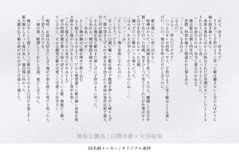 ☀️☆quiet followDONE零受けSSのlogさされいとろしょれいとサカ零ちょっぴりえっちなのもあるよ(あと誤字脱字)多分増えていく show all(+12 images) Tap to full screen (size:910x590).Repost is prohibited Let's send reactions! freqpopularsnackothersPayment processing Replies from the creator Follow creator you care about!☆quiet follow ☀️DONE「狂うには優し過ぎて、」共依存な短いけどヤッてる一零個人的にハッピーエンドだと思ってる。アンケートでいちれ〜に決まった時、驚いた。 2769 ☀️MOURNING欠けた月を喰む/簓零サカ零前提の遺されたさされいのお話※死ネタこちらは身内アンソロとして寄稿した『遺骨』をテーマにした性描写があるさされい小説です。昨年の今頃書いたものなので設定に少々誤りがありますが目を瞑って、誤字脱字なども心の目で読んで頂きますようお願い致します。 16 ☀️DONE「あめだまころころ」猫の日の眼球舐め盧零これはろしょれいと言い張りたい。何もすけべじゃないし唐突に始まって唐突に終わる。れいろに見えるかもだけどれいろじゃないよ! 3932 ☀️DONEいい子だった/盧零色々と忙しいろしょとずっと我慢してたけど欲求不満でオナニーしちゃうれさんのろしょれい 6 ☀️DONE柔らかくて甘い/簓零男を抱くのは初めてのおささと抱くのも抱かれるのも慣れてる筈なのにおささと付き合って初めてのセックスで処女返りしちゃうれさんのさされい※パスワードはさされいの誕生日を足した数字と18↑か(y/n) 30 ☀️MOURNING物事には順序がございます/盧零6月1日のろれいの日に上げたかったえっちなろしょれい※パスワードはろしょの誕生日四桁+18↑か(y/n) 10 recommended works sasadakeDOODLE AritoyaCAN’T MAKE 2 KateeAyamiDOODLEcute… ぽこ・ぽ・ぬんたぬTRAININGゲ…らくがきログ20(父水中心) 20 sol_totoiCAN’T MAKE同居人げんみ❌幸せになれーーーーーッ!!!! 花梨。MEMOギャンブラーとバニーボーイの組み合わせはいいぞ。飛ぶぞ。⚠️bcis⚠️🔞ではないけど匂わせ?てる⚠️カジノの仕組みわかりません 1042 manzanillaDONEThey're having a good time *ñam* Ryurumi❤️🔥+18? (yes/no)Ryuji © kyankennnHarumi © mxnzxnilla nayama1010SPOILER POI11254581DOODLE読む方向 -> です 2