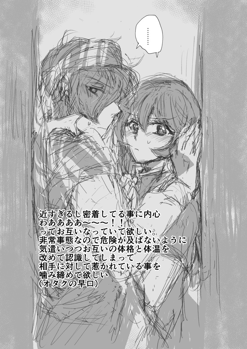 推しカプが狭い空間に閉じ込められるやつが急に見たくなった…。まだ両片想いくらいの時期に命には関わらないけど(大事)こういう罠に巻き込まれてなんやかんやお互い意識して欲しい