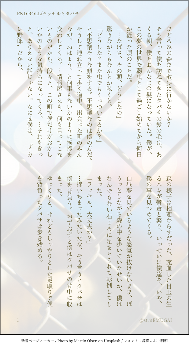 sesesensesensese☆quiet followDONE『BE MY BROTHER.』ENDROLLのSS、ラッセルとタバサTRUE2のEND後世界線 #ENDROLL #END_ROLL #エンドロール endCreditRoll show all(+2 images) Tap to full screen (size:618x1132).Repost is prohibited Let's send reactions! freqpopularsnackothersPayment processing Replies from the creator Follow creator you care about!☆quiet follow sesesensesenseseDOODLEトラリセ3の思い出サークル参加して写真集頒布も叶いとても楽しかったです🌸 2 sesesensesenseseDONE『BE MY BROTHER.』ENDROLLのSS、ラッセルとタバサTRUE2のEND後世界線 3 sesesensesenseseMOURNINGENDROLL過去SS、某所にて龍禅一人称生前の皆がうっすらであれ関わりあいがあったらいいいな・・・と思っています sesesensesenseseMOURNING龍禅とラッセルしかいないENDROLL過去SSが3作です。順に読むと繋がっているようにも読めるかも 3 sesesensesenseseMOURNINGENDROLL過去SS、ドグマ×コーディ。コーディのみ登場 sesesensesenseseMAIKINGしゅにゃちゃん related works sesesensesenseseDONE『BE MY BROTHER.』ENDROLLのSS、ラッセルとタバサTRUE2のEND後世界線 3 はくてん あめDOODLEENDROLLプレゼン(裏) 4 kinakoro0141DOODLEお久しぶり〜です。ENDROLLの現在の表向きのプレイ日記です。相互さんに教えてもらった絶望系フリーゲームに絶望してて全然浮上出来てないです。カンテラ先生が救われるルートはないんですか。あとどんどん仲間がゴリラになって主人公お荷物やんと思ってたら強く殴れるようになりました。みんな強い 5 kinakoro0141DOODLEENDROLL、4日目ネタバレ注意です。クリアしました。ついでにレベル上げとかがっつり遊んでおりました。お金を払うので閑照先生を誰か救ってください。後で記念絵描けたらと思います。キャラクターが濃くてこんなん無料でいいのかってくらいとても面白かったです。ぜひやって欲しい。 4 そうびMOURNING絵茶ログ いずもPASTかんてらさんどぐまさん 2 あずまPASTずっとハマっていたので絵柄の変化がすごいです。一応思い出として。 29 あずまMOURNINGちょっとだけ関係性ありやにょたなども。 8 はくてん あめDOODLEENDROLLプレゼン(表) 8 recommended works ...PAST PiccccrusSubREDPROGRESShttps://twitter.com/piccccrussubred/status/1188829715554918402?s=21の作業工程。影のみでもしっかり描き込めばそれなりの出来になるんだよ〜っていうのを実感したっていうのを共有したかった情報屋くんかわいいよしーがー 4 sesesensesensesePASTENDROLLのアナログ絵やっぱり神様なんて居なかったね(故アカウントの頃に描いた消し炭コーディちゃん) こうまDOODLE #tohanoim #TOWER_of_HANOI しあわせ---落書き クレヨンちゃん※おまけ部屋2Fねたばれ↓悲劇で上書きしてきた夜の木管理人さんへとてもしあわせだって、笑ってくれるクレヨンちゃんがいたらいいな mizuteppoDOODLE「TOWER of ET ジョルジュ編」の設定資料的な何かです。読後の閲覧をお勧めします。passは第●の塔3階でのジョルジュの正答率(半角数字二桁) 2 EmilyDOODLE猫の日のさらに続き〜パスワード:18↑? 2 宇宙子DOODLE【タワハノ腐向け】【コーロラ】「この前、胸ぐらを掴まれたお返しだっ!」 宇宙子DONE【タワハノ】【ローランド+ナナシ→コーラル】エレクトリック事故チュー。ギャグですが腐風味です。捏造設定あり。アダムスもいるよ。 4 tamago____fwfwSPOILER※T2「互いの譲れぬもののために」