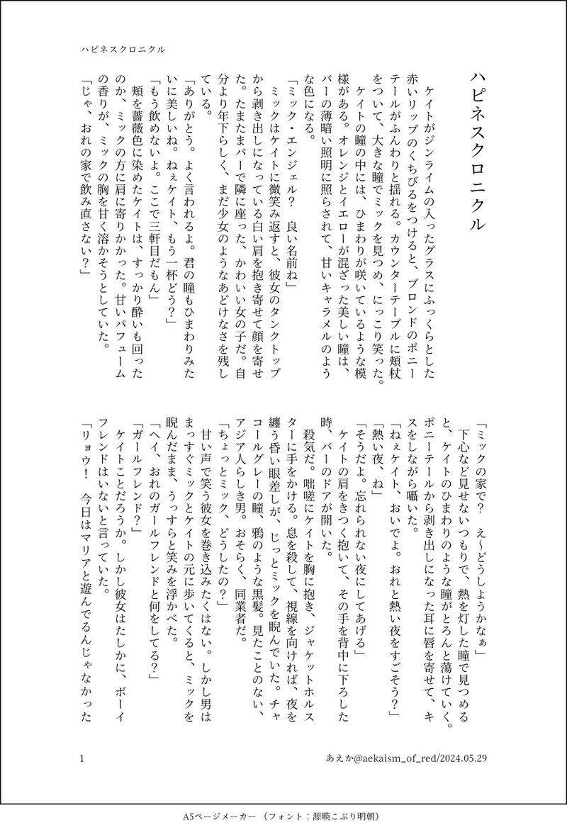 aekaism_of_red☆quiet followDONEミックと獠の出会いのお話を捏造して書いたよ!北米で出会ったふたりが幸せになるまでのおはなし。pixivにも載せました!https://www.pixiv.net/novel/show.php?id=22275047 show all(+6 images) Tap to full screen (size:888x1300).Repost is prohibited Let's send reactions! freqpopularsnackothersPayment processing Replies from the creator Follow creator you care about!☆quiet follow aekaism_of_redINFO10月19日のジャンルオンリーでの新刊のサンプルです。正式なものは、お品書きと共にpixiv等に出す予定です!新刊の部数アンケートと、既刊のアンケート実施しています。本の詳細はアンケートに載せているので、よろければご協力お願いします!【新刊】秋霖雨抄( 10月CHオンリー)、既刊2種アンケートhttps://forms.gle/82tCtLvM1vrofGZZA 3372 aekaism_of_redDONE秋になった気配がするので小話! 2 aekaism_of_redMEMO7/13オンリー新刊『空白をゆく帆船』の感想フォームにいただたメッセージの返信です!ありがとうございました!!!!! aekaism_of_redMAIKING昔のSS漁ってたら出てきたんだけど、これなんだろう?朝起きたら、シュガボと若りょになってた二人のお話……どこかに出してるんだと思うけど見当たらないので備忘録に。しかも書きかけだ😂 3134 aekaism_of_redDONE『恋しさの温度』香ちゃんに夜這いをかけようとしているような……みたいなりょおのお話! 3 aekaism_of_redDONEこれ書きました!張り込みをする獠香冴子ちゃんのお話!獠香で槇冴みたいなおはなしです!後半あえて視点変えてますが、読みにくかったらすみません!https://x.com/aekaism_of_red/status/1949684876434944395?s=46&t=1osAIaw4MjsMPmH6I5g14g 6 recommended works c_hipuma_iINFO8/25インテCLB4出ます!サンプルはこちら👇[R-18] 【8/25インテCLB4】理銃新刊 | ちまる #pixiv https://www.pixiv.net/member_illust.php?mode=medium&illust_id=76430311 2 しぐまんDONEトゥルルルルルルルルル 2watoyoINFO【星エコ】1周年あわせ落書きまとめ、UPできましたー。先日の「こんな表紙」からけっこう変わってしまった^^;【星エコ】落書き詰(2020/5/28~2020/11/27) | にわとよ #pixiv https://www.pixiv.net/artworks/85967933 くろしのINFO【DCDNC】pixivに上げましたのでよろしくお願いしますフェン武器log | 黒筱@SKuromiya #pixiv https://www.pixiv.net/artworks/86369982 ひつひつDONEこんにちは。描きかけのものを仕上げました。「おかえりなさい」。田んぼシリーズの2作目となりました。よかったらこちらで他の絵もご覧ください。#pixiv ページ(https://www.pixiv.net/artworks/90102978) ななめDONEぴくしぶにも載せています。【創作BL】君の呼び名(広瀬と入江その1) | ななめ #pixiv https://www.pixiv.net/artworks/92685928 10 givemestnDONEみつみねさんがお描きになっていたドラゴンテール魈蛍ちゃんがはちゃめちゃに可愛くてアイデアをお借りして描いてみました〜💕(許可いただきました!)原案のみつみねさんの作品はこちらです❤️❤️↓ 【魈蛍】私が楽しいお絵かきとガチャまんが | みつみね #pixiv https://www.pixiv.net/artworks/95386109みつみねさんありがとうございました〜💕 3 火燈弥紗💀🔥Skeb募集中INFOpixivに投稿しました 【腐】UT(AU)log5 | 弥紗 #pixiv https://www.pixiv.net/artworks/96071239 良かったらブクマといいねをよろしくお願いします。 エリンギ猫DOODLE君の温もりが1番の癒し | エリンギ猫 #pixiv https://www.pixiv.net/novel/show.php?id=17237814起きたディルックの短いお話 1450