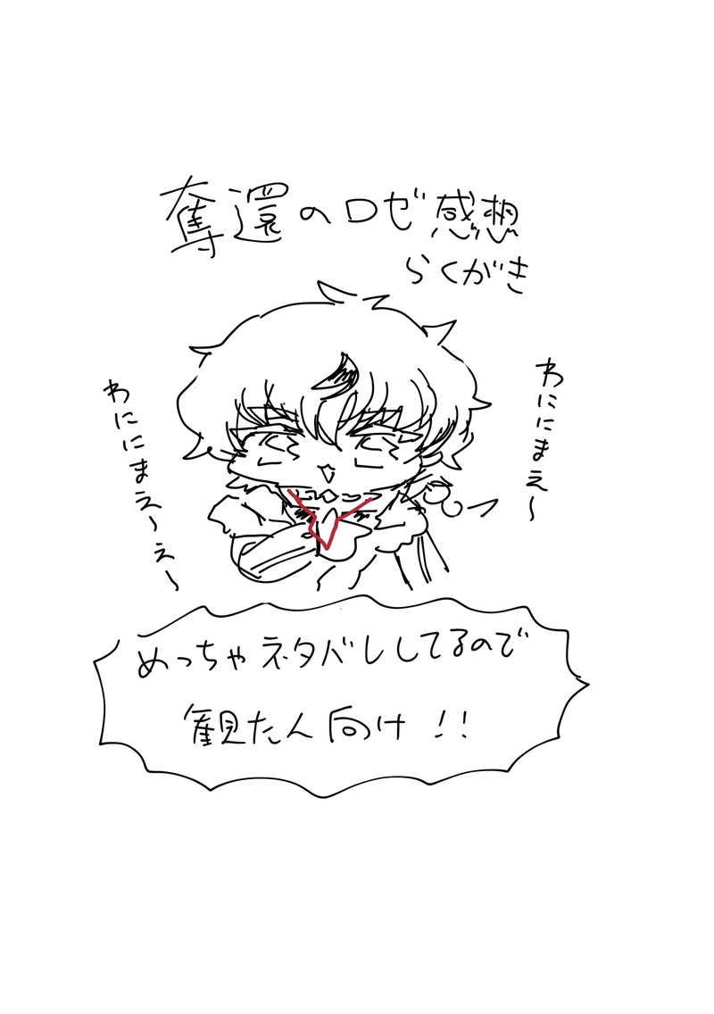 なも!☆quiet followSPOILER奪還のロゼ1章おもしろかったです!このスピード感で楽しませて欲しい…感想は映画の内容に触れていますのでネタバレ回避したい人は気をつけてください〜 show all(+8 images) Tap to full screen (size:1298x1844).Repost is prohibited Let's send reactions! freqpopularsnackothersPayment processing Replies from the creator Follow creator you care about!☆quiet follow なも!INFOベビ帝色紙プレゼント企画抽選ツールより、当選者は9,1,14でした!ご応募ありがとうございました🙇 3 なも!PAST2022年の7月に出したスザルル本のweb再録完全版です。イラスト本以外で、スザルルの漫画はこれが初の本だったのですが趣味丸出しで、脂が乗っている正気の無さですね。一部は女児アニメのパロなので元ネタがわからないとピンとこないかもしれません…でもこれをきっかけに一度プリパラとかプリティーリズムとか見てもらえると嬉しいです(強欲またかわいい格好したスザルルは描きたいな〜って思います。 32 なも!SPOILER奪還のロゼ 3幕の感想まとめ総括して、アッシュくんに幸あれ…と思いました。ネタバレ感想絵です。 13 なも!SPOILER奪還のロゼ、2幕観てきました!個人的に思うところもありましたが、全体的に今回も面白かったです!!ネタバレらくがきまとめです。 13 なも!SPOILER奪還のロゼ1章おもしろかったです!このスピード感で楽しませて欲しい…感想は映画の内容に触れていますのでネタバレ回避したい人は気をつけてください〜 9 なも!DONE今年の3月に出した新刊ですが、特殊装丁(箔押し、カラー口絵あり)にしたため完売して再販する予定ないので、ロススト2周年のナナリーインワンダーランドの祭りに便乗して再録します。楽しく苦しく睡眠削り一週間で描き上げた代物ですワチャワチャとしたノリで進むいつもの味ですが楽しんで頂けたら幸いです! 24 recommended works なも!DONEスザルルが女児筐体ゲームをする漫画。WEB展示で掲載してました。ロイティ2お疲れ様でした!実はオンリー滑り込み申し込みで、9月に入ってからネーム切ったんですが、あれよあれよと勢いで書き上げました!スザルルはパワー!!!(?) 15 餅樹(びいどろ)DOODLE着替え途中のルの手を掴んで誘うス @maaa_slgpDONEロイティ用 2つ目です!弟大好きな義兄スザクと自己肯定感激高の義弟ルルーシュ 3 mamumamu_mamuoDOODLEらくがき置き場02不定期に増えたり消えたり 8 yawaraka_fuyodoDOODLEなぞのパロ 。。。DOODLEギ 11 qiyeputi1DOODLE 9401 qiyeputi1DOODLE 8809 qiyeputi1DOODLE 3864
