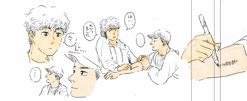 突然かかってきたパク中士からの電話に、メモを書き留める場所を探していたホヨルは、目の前のジュノの腕をつかんでペン先をたてた。