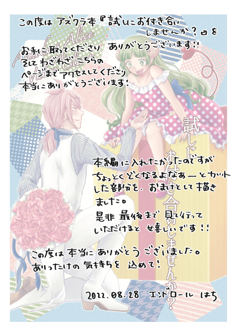 hachicoro93☆quiet followDONE『試しにお付き合いしませんか?』本購入者向けのおまけ漫画です。パスワードは本の後方に載っています。SNSを含むWebへの掲載はお控えください。本を購入いただきましてどうもありがとうございました。ありったけの気持ちを込めて。2022年8月28日エンドロール はち ##アズクラ show hide show all(+8 images) Tap to full screen (size:1120x1582).Repost is prohibited Let's send reactions! freqpopularsnackothersPayment processing Replies from the creator Follow creator you care about!☆quiet follow hachicoro93DONE3月19日バビデビにて公開しました。5月か8月に頒布予定のアズクラ本の冒頭5ページです。付き合ってます。アホなラブコメ目指しました。※まだ途中なので、背景等追記予定です。暖かい目で見てくださると嬉しいです。 5 hachicoro93DONE表紙は詐欺なんですけどねネットにあげるとアラに気付いたりするからもう少しいじるかもしれない hachicoro93DONE2023年1月発行予定のアズクラ本の冒頭部分です。Passはバビデビパーリィナイト4の問題児クラスエリアう6『エンドロール』のおしながきにて。付き合ってない大人アズクラが、イルマや問題児クラス、カルエゴたち大人組の力添えで進展するかもしれないお話です。進捗はやばいです。 3 hachicoro93DONE『試しにお付き合いしませんか?』本購入者向けのおまけ漫画です。パスワードは本の後方に載っています。SNSを含むWebへの掲載はお控えください。本を購入いただきましてどうもありがとうございました。ありったけの気持ちを込めて。2022年8月28日エンドロール はち 9 hachicoro93DONE『試しにお付き合いしませんか?』(仮題)アズの片思い?アズクラ本です。8月28日発行予定の本の冒頭15Pです。進捗はヤバめですが、後戻り出来ないように公開します。全98P予定です。引き続きどうぞよろしくお願いいたします! 15 hachicoro93DOODLER18。2枚。モロ出しと最中なので閲覧注意。passは鍵垢。 2