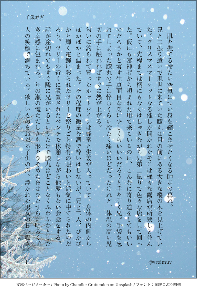 reimu☆quiet followDONEクリスマスっぽいの書きたかったのになんか薄暗くなった。ヤドリギのリース乗せてキッスしてほしかっただけです。タイトルは思いつかなかったので万葉集からつけました。クリスマスとは??? #髭膝 show all(+6 images) Tap to full screen (size:630x928).Repost is prohibited Let's send reactions! freqpopularsnackothersPayment processing Replies from the creator Follow creator you care about!☆quiet follow reimuDOODLEあと6日…誰か私に猿轡を…… reimuDOODLE振り返り配信というなの短い宴の再来を祝して、別垢にあげていた写経です。通常衣装もさいこ~だったし内番服のだいすき事件も気が狂うので全人類22日の配信を見て下さい。 4 reimuDOODLE※2.5/妄想(強めの幻覚)あの衣装でアモーレするとは思わないじゃん…… reimuDOODLEアモ丸さんのらくがき完成版。 reimuDOODLE※アモ衣装多分こんなポーズ絶対にしないという葛藤と戦いながらの塗り絵です。自己満足なのでよいのです。 reimuDOODLE映画本丸の弟さん①パヤがとっても元気②姫カットがパッツンじゃなくて内巻きみたいで可愛い③襟足が長い④チョロ毛が短い⑤おめめぱっちりだけど睨むと蛇っぽい⑥お口の開き方「Δ」って感じで可愛い※個人の所感です related works うすいPROGRESS普通に間に合いませんでしたよね 灯野くずはPROGRESS7月12日の大阪で知己のサークルさんが配布してくれる髭膝ペーパーの漫画の進捗。 4 うすいPROGRESS事後丸♀とにじゃ だいたい七割DOODLE 2 だいたい七割DOODLEラフと清書 赤面 弟のみ つもりで描いてる 3 パイナップルそばまんじゅうPROGRESS初夜でしていい体位じゃないんだわ あっきではないBLANK媚薬盛った髭膝「兄者はよっしゃぶち犯すなんて言わない」 長靴ーPROGRESS酒飲み膝くんの進捗です〜〜〜早く再会させたいですねぇ… 3 め ろDOODLE我慢できずにアレな髭膝を描いてしまいました(R15くらい) 2 recommended works I_5sukeDOODLE #髭膝 R._unknownPROGRESS髭膝ラフ。…塗りどうしようか…。 rossankudasaiDOODLE※双騎衣装クロニクルの衣装のジャケット抜いだ姿みたいな~!(実際はジャケットと繋がってるだろうけど)っていうのとフレーム使って遊んでた。髭膝(一応) rossankudasaiSPOILER10/3ソワレ 箱根日替わり回で↓みたいなやりとりあったシーンの筥王がどちゃくそ可愛いがすぎてやばかった…あれ素であの顔だったよな…筥「ま~か~はんにゃあ~はら~み~た♪(香水みたいな感じに歌ってた)」別「うるさい!」筥「ん?(小首を傾げる)ハッ🤭ちゅうちゅう🐭💦」 うすいPROGRESS事後丸♀とにじゃ 87taPAST【星の下で】プロローグ髭膝現パロです。二年前の個人誌をWEB再録用にちまちま描きなおし中。つづく。 4 うすいPROGRESS遅々として進まぬ 灯野くずはPROGRESS6月予定の髭膝本の原稿。 2 パイナップルそばまんじゅうMOURNINGキ♡スの日おめでとうございます