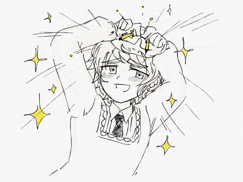 『割烹着姿で照れた顔をしながらシャーペンをへし折る晶』
