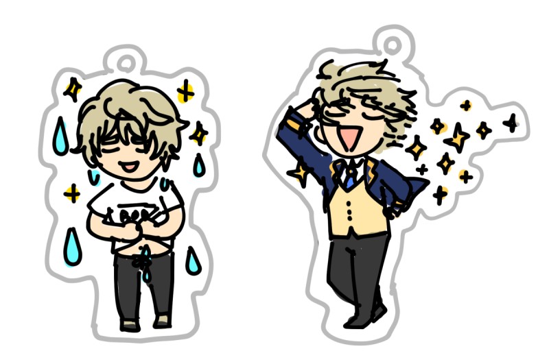 雨に降られた晶くんアクキーと超極風が強い日の晶くんアクキーの絵(超極はスーパーキワミと読みます)(存在しないアクキー)