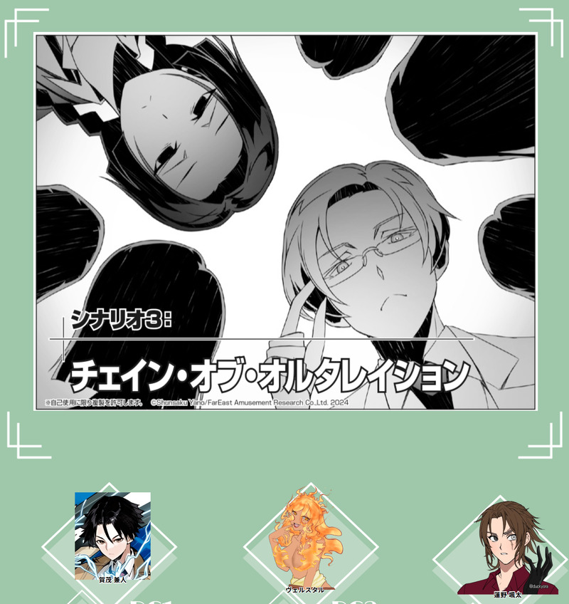 real_me_queen☆quiet followMEMODX3 チェイン・オブ・オルタレイションGM:こやさんPL:Shineさん、私、みんちさん Tap to full screen (size:1516x1607).Repost is prohibited Let's send reactions! freqpopularsnackothersPayment processing Replies from the creator Follow creator you care about!☆quiet follow real_me_queenDOODLEありす、雑な立ち絵いじり real_me_queenMEMOイタリャーナ・ヴィアッジョ!〜美食編〜KP:私PL:imokenpiさん、いるさん、あっとさん静テロ継続 real_me_queenMEMO静なるテロリスタKP:藤原鎌足さんPL:私、いるさん、imokenpiさん、あっとさん(HO順)全生還 real_me_queenDOODLEにぎにぎにじたうん!をありすにやって欲しかった落書き real_me_queenPAST幽世常世の満天下 HO3 「八蝶(バーティエ)」2023年 作 real_me_queenMEMOストリテラ「魔女は朱き月の夜に」ふうかさん、なきほさん、cotaさん、私