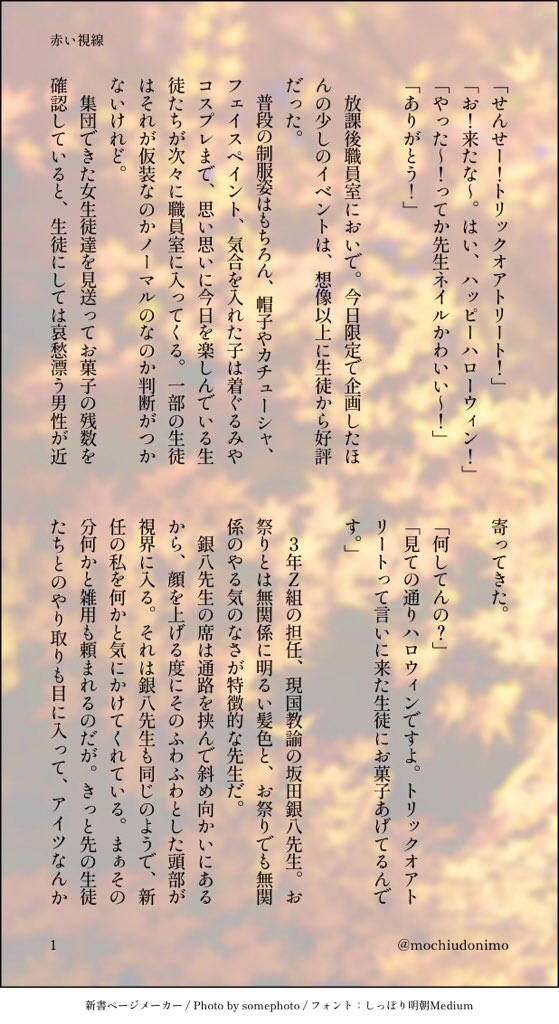 mochiudonimo☆quiet followDONE銀八先生夢 ハロウィンネタ ##夢 show all(+3 images) Tap to full screen (size:559x1024).Repost is prohibited Let's send reactions! freqpopularsnackothersPayment processing Replies from the creator Follow creator you care about!☆quiet follow mochiudonimoDONE銀八夢 シリーズ化予定ある程度溜まったら名前変換できるとこで再掲予定です。 2 mochiudonimoDONE銀八先生夢 ハロウィンネタ 4 mochiudonimoDONE八高 ハロウィンネタ『ぱったか版深夜の60分1分勝負!期間限定ワンドロ&ワンライ』 #pattaka_1draw 3 mochiudonimoDONE私はこうなりたかったんだよ小説⚠️夢主はほぼモブだし9割銀高。⚠️アルタナ後高杉生存if 5 mochiudonimoDONE140字SS 夢随時追加 5 mochiudonimoDONE140字SS BL随時追加 2 recommended works ユードリルDOODLEトリコさんと小松くんの状況2人で将来について話している#お題ガチャ #場面設定ガチャ はるしきTRAINING慟哭フウモクというかフウ→モクフウ独白『フウガがはじめて抱えた悩みはモクマが全然振り向いてくれないことだ』#お題ガチャ #攻めが片想い気味ガチャ 419 tizyoutoumikmtDOODLE「お題ガチャ。」※同棲炭煉たんじろうが席を離れた隙に、たんじろうのスマホで自撮りを撮るきょうじゅろう。#お題ガチャ #色々な二人ガチャ https://odaibako.net/gacha/1837?share=tw炭君が携帯にロックかけてないのが不用心に思ったのでこんな写真がた他人に見られたらやばいだろう?って意味を込めて撮った煉さんロックはしっかりかけるようになった炭君。 小さな葉っぱDONEワルロゼ(ワルイージ×ロゼッタ)の短いものです。お題ガチャでお題を頂きました。頂いたお題↓【推しカプシチュガチャ】「好き」と伝えるのが恥ずかしくて何も言えなくなってしまうロゼッタと、それを言ってくれるときを辛抱強く待つワルイージ #お題ガチャ #推しカプシチュガチャ https://odaibako.net/gacha/963?share=tw 347 はっちDONE全年齢/月鯉原作軸/現パロごちゃまぜ1p漫画×5つ#お題ガチャ #お互いが大切なふたり恋音2用に書いたものです! 6 アヤコDOODLE湯船に浮かべるアヒルのおもちゃを犬に買って帰った友。自分のことを一体なんだと思っているのか、疑問に思いつつもふつうに可愛がってお風呂に持ち込む犬。。#お題ガチャ #同棲カプのゆるい話 2 茶時間DOODLE花火とおばあちゃん 年明けうどんDOODLE落書 うさかどうさがんばれおじさん! 負けるな免疫力!お題ガチャより↓珍しく風邪をひいたウサミ。ウサミを半ば強引に床につかせ、不器用ながらも懸命に看病をしてくれるカドクラさんに微笑ましい気持ちになる。#お題ガチャ #相手に巨大感情を抱く二人 odaibako.net/gacha/13249?sh… 55wu55REHABILI【お題】【哪吒様】推しにベビードールを着せる