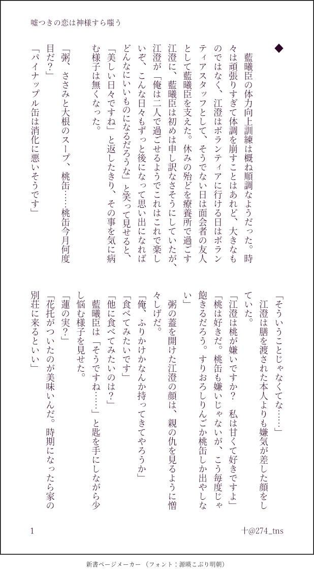 274_tns☆quiet followDONE嘘つきの恋は神様すら嗤う3⚠現代AU病弱な曦とボランティアの澄のお話 show all(+7 images) Tap to full screen (size:618x1132).Repost is prohibited Let's send reactions! freqpopularsnackothersPayment processing Replies from the creator Follow creator you care about!☆quiet follow 274_tnsDONEバニー澄と曦三部が始まります。次回、魏無羨のターン。 10 274_tnsDONE #曦澄ワンドロワンライ 「禁言術」⚠現代AUお題お借りしました 5 274_tnsDONE嘘つきの恋は神様すら嗤う5⚠現代AU病弱な曦とボランティアの澄のお話最終話お付き合いありがとうございました! 9 274_tnsDOODLE嘘つきの恋は神様すら嗤う4⚠現代AU病弱な曦とボランティアの澄のお話どきどきの外泊回 6 274_tnsDONE嘘つきの恋は神様すら嗤う3⚠現代AU病弱な曦とボランティアの澄のお話 8 274_tnsDONE嘘つきの恋は神様すら嗤う2⚠現代AU病弱な曦とボランティアの澄のお話 9 recommended works amaneazumaaDOODLE夜狩りでちょっとへまして凍えそうな季節で暖め合おうな曦澄。曦澄ワンドロワンライ「看病」より。本編後の出来上がってる設定で看病?という内容ですが看病。若干のシリアスで若干の流血ありです。 5 amaneazumaaDOODLE暴れ江澄。アクション楽しいのみで書いていたんで藍曦臣は登場で時間切れ。私以外に抱きしめられておこな曦澄のネタもちょっと思いついたのでワンドロトは別で追々書いていきたい。 7 amaneazumaaDOODLE相合い傘を企む藍曦臣と阻止を目論む江澄な曦澄。曦澄ワンドロワンライのお題「雨」かっこよさは存在しない。 5 amaneazumaaDONE曦澄ワンドロワンライ「中秋節」より。遅刻。座学時代の設定。曦澄?って雰囲気で曦臣兄さんがきゃっきゃうふふしてはしゃいでる感。 6 amaneazumaaDONE曦澄ワンドロワンライのお題「変装」より邪祟の目をだまくらかすために女装しようぜって感じの女装です。そして残念な感じの兄上です。ご注意下さい。 8 3h1364rYPW5q2mOMOURNING曦澄ワンドロワンライ。お題。喧嘩。甘々になってしまった。お題は初投稿です。駄文お許し下さいませ。 886 pk_3630DONE #曦澄ワンドロワンライ 開催ありがとうございます。お題「喧嘩」お借りしました。現代AUで同棲中の二人です。季節感はスルーでお願いします。※蜜柑の食べ方への考えはあくまで創作上のことで何かを否定するものではないことをご承知おきください。 2592 3h1364rYPW5q2mOMOURNING曦澄ワンドロワンライ。お題「音」何番煎じかわからない香炉ネタです。読んでいただけたら幸いです。主催者様、開催ありがとうございます。 1454 yunoDONE #曦澄ワンドロワンライ 『嘘』にて。双傑がほのぼのお茶してます。夫が嘘をつかないっていいね、俺たちは幸せ者だなあってしみじみする話です。 2955