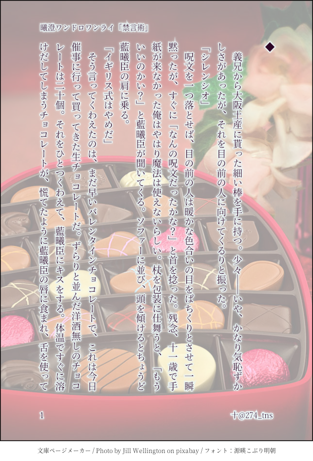 274_tns☆quiet followDONE #曦澄ワンドロワンライ 「禁言術」⚠現代AUお題お借りしました show all(+4 images) Tap to full screen (size:630x928).Repost is prohibited Let's send reactions! freqpopularsnackothersPayment processing Replies from the creator Follow creator you care about!☆quiet follow 274_tnsDONEバニー澄と曦三部が始まります。次回、魏無羨のターン。 10 274_tnsDONE #曦澄ワンドロワンライ 「禁言術」⚠現代AUお題お借りしました 5 274_tnsDONE嘘つきの恋は神様すら嗤う5⚠現代AU病弱な曦とボランティアの澄のお話最終話お付き合いありがとうございました! 9 274_tnsDOODLE嘘つきの恋は神様すら嗤う4⚠現代AU病弱な曦とボランティアの澄のお話どきどきの外泊回 6 274_tnsDONE嘘つきの恋は神様すら嗤う3⚠現代AU病弱な曦とボランティアの澄のお話 8 274_tnsDONE嘘つきの恋は神様すら嗤う2⚠現代AU病弱な曦とボランティアの澄のお話 9 related works sumiwatariDOODLE #曦澄ワンドロワンライ #曦澄タグ失礼します。お題「雨」遅刻ですが参加させてほしい・・・・!雨音で聞こえなくなってしまう二人の音・・・・ 西村ルルDONE原作軸曦澄 お題:避暑。ワンライ用です。忘羨と三人で異常気象の姑蘇を抜け出した沢蕪君。蓮花湖で泳ごうと提案してきた魏嬰のせいで新たな性癖に目覚めてしまう……? 4 amaneazumaaDOODLE暴れ江澄。アクション楽しいのみで書いていたんで藍曦臣は登場で時間切れ。私以外に抱きしめられておこな曦澄のネタもちょっと思いついたのでワンドロトは別で追々書いていきたい。 7 amaneazumaaDOODLE夢だけど夢じゃなかった曦澄ワンドロワンライ。タイムアップだったので、曦臣目線による江澄がリバースしたのでお着替えさせるシーンはカット。両片思いだったので、兄上はどきどきしながら着替えさせました 5 amaneazumaaDOODLE相合い傘を企む藍曦臣と阻止を目論む江澄な曦澄。曦澄ワンドロワンライのお題「雨」かっこよさは存在しない。 5 amaneazumaaDOODLE夜狩りでちょっとへまして凍えそうな季節で暖め合おうな曦澄。曦澄ワンドロワンライ「看病」より。本編後の出来上がってる設定で看病?という内容ですが看病。若干のシリアスで若干の流血ありです。 5 raiden_bby01REHABILIテスト投稿 遙直輝DONE #曦澄ワンドロワンライお題「お月見」「月餅」お借りしました。相変わらずの遅刻、そしてタイムオーバー(1+2hくらい)。ワンとは…すみません。出来上がって割とすぐなふたり。ふわっとお読みください。【十六番目の夜に】 7 yunoDONE #曦澄ワンドロワンライ のお題『手紙』に挑戦。筆蹟診断スキルを張り合う兄上です。愛しい人のことは自分が一番わかっていたいというやつです。2022/08/21 02:06 up 3091 recommended works amaneazumaaDOODLE相合い傘を企む藍曦臣と阻止を目論む江澄な曦澄。曦澄ワンドロワンライのお題「雨」かっこよさは存在しない。 5 amaneazumaaDONE曦澄ワンドロワンライ、盛夏より。熱帯夜で目が覚めた曦臣とすやすや江澄。いつもに比べて大人しい感じになったのは江澄が寝てる所為だと思われます。 4 鶏斉根DONE曦澄ワンドロワンライ第13回 お題:食事距離を詰めたい人と、気づきたくない人と。 2 yunoDONE #曦澄ワンドロワンライ の『喧嘩』に参加してみました。が、喧嘩はこれから始めようかって感じだし、曦澄よりも懐桑と江澄が仲良くしてます。江澄が懐桑の着せ替え人形にされてて、兄上がハラハラする話です。 3857 pk_3630DONE #曦澄ワンドロワンライ 開催ありがとうございます。お題「喧嘩」お借りしました。現代AUで同棲中の二人です。季節感はスルーでお願いします。※蜜柑の食べ方への考えはあくまで創作上のことで何かを否定するものではないことをご承知おきください。 2592 refrain0411DONE魏無羨が居なくなって1年後くらい(藍忘機は面壁中。)曦臣→江澄の状態初参加です。1時間でまとめるのって難しいですね…何度も書きながら混乱して、お題に沿っているのかも怪しい気もする…💦1時間で描いたり書いたりされる皆さんを今まで以上に尊敬しました。誤字脱字もあるかと思いますが、とりあえずはこれが私の1時間の実力だと言うことで💦 1944 yunoDONE #曦澄ワンドロワンライ の『お題:手』に参加しました。犬と戯れる江澄と、それをほのぼの見つめる藍曦臣と雲夢の民のお話です。 2585 yunoDONE #曦澄ワンドロワンライ の『犬』にて。江澄が新たな犬を飼うほのぼの話です。曦澄は遠距離婚の熟練夫夫みたいな感じ。兄上が策士っぽい。 2572 qinglin213DONE一个人出门太危险了,带上这个吧