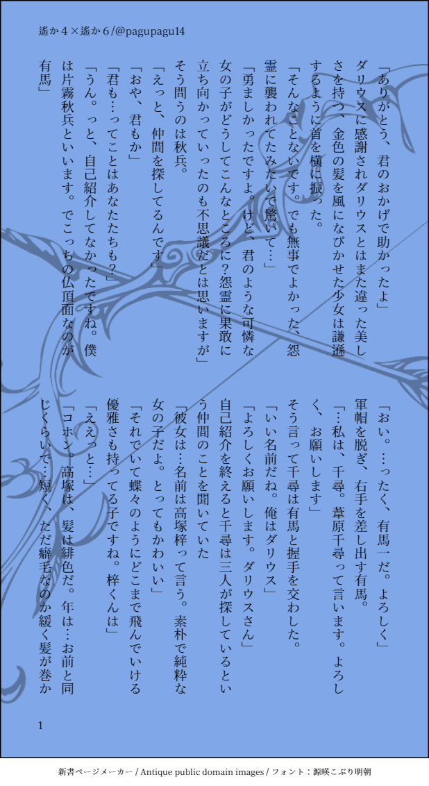 pagupagu14☆quiet followDONE遙か4×遙か6 風千前提で、DSのやつみたいに逸れてしまった八葉+神子で千尋がダリウス、秋兵、有馬と行動を共にする――みたいなそんな話。次は風千、有梓前提のクロスオーバー書きたい #遙かなる時空の中で4 harukanaruTokiNoNakade4 #遙かなる時空の中で6 harukanaruTokiNoNakade6 #風千(遙かなる時空の中で4) show all(+4 images) Tap to full screen (size:618x1132).Repost is prohibited Let's send reactions! freqpopularsnackothersPayment processing Replies from the creator Follow creator you care about!☆quiet follow pagupagu14DONE甘えたい姫と、ため息を吐く従者/淡雛ベストエンド後のあるひとときの話。淡雛は逆に淡雪が膝枕して欲しい〜〜という想いから 888 pagupagu14DONE二人きりの誓い/悠雛(ブラハ)最新CDの芹仁菜聞いてから悠雛が書きたくなって書きました…ゲーム本編から数年たってどっちも成人してる設定です!悠雛って芹仁菜同様、【ふたりきり】みたいなの似合うよな~~ 1509 pagupagu14DONE出会えた奇跡/優この(ダイナー)事後設定の優このです。このはの恋愛経験捏造してます。あと学生時代の感じとかも捏造してます出会ってくれてありがとう優この〜〜〜〜😭 722 pagupagu14DONE諍いとお茶会/シルフィール→アリシア←リューク(魔法使いとご主人様)シルフィール狙いしながらめちゃくちゃ書きた~~~~い!ってなったネタ。シルフィール√もう確定やろ!みたいな時期くらいのお話ですきっと 1111 pagupagu14DONEバレンタインプレゼントはあなた/イーティファ(ラディアンテイル)これにてバレンタインラディアン推しカプSS期間は終了!イーオンの意外と熱っぽいところ好きだよ… 1330 pagupagu14DONEあなたに出会えて本当によかった/ザフォティファ(ラディアンテイル)FDステラ撮り下ろしボイス時空ぐらいのザフォティファのバレンタインのお話です。ザフォラはこう言うことしそうで好き 756 related works pagupagu14DONE遙か4×遙か6 風千前提で、DSのやつみたいに逸れてしまった八葉+神子で千尋がダリウス、秋兵、有馬と行動を共にする――みたいなそんな話。次は風千、有梓前提のクロスオーバー書きたい 5 recommended works りか@ri08szPROGRESS4コマの以蔵さん#FGO オアスシPROGRESS harupiyoponDONE加工済み、ラフ、加工前のアルジュナ 3 きりゅーDOODLEりゅーたん難し過ぎ…( ˇωˇ )星4配布の時、土下座して来てもらったくらい好きなので頑張りたいです。 4 大豆よろずTRAINING概念礼装「花園の少女」です! コウ@sbg_kouTIREDFGOにハマって、フォロワーさんの推しを描いてあげると言いつつ線画で止まってる子たち… 2 surisibaPAST #FGO 13 はるろMOURNING #FGO mommoDOODLE寝る前に描いた謎ポーズビリーくん