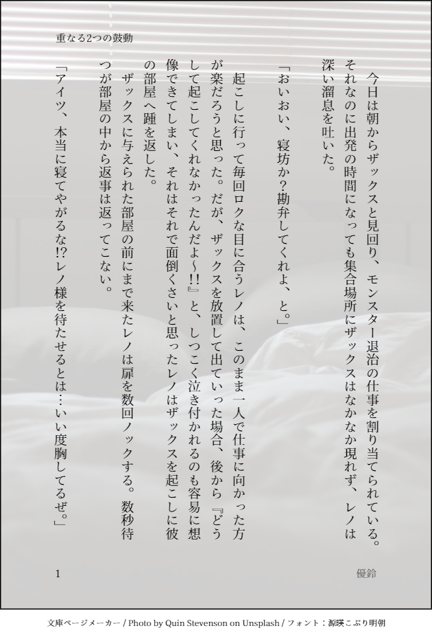 ゆうりん☆quiet followDONE【重なる2つの鼓動】「ザックス…ここにいるよな…?」オペラオムニア時空のザクレノです。 #ザックス sachs. #レノ leino #ザクレノ #FF7 show all(+7 images) Tap to full screen (size:630x928).Repost is prohibited Let's send reactions! freqpopularsnackothersPayment processing Replies from the creator Follow creator you care about!☆quiet follow ゆうりんDOODLE不二×菊丸のSS 186 ゆうりんDONE会話してるだけの先輩後輩なザクレノ 670 ゆうりんDOODLEメイドの日に遅刻したレノ×ルード(レノルド)ほんの少こーしえろ注意。 301 ゆうりんDONE春のザクレノ現パロの続きです。レノは桜の精。ザックスは大学1年生。 513 ゆうりんDONE遅ればせながら、ホワイトデー風味な短いレノルーです。 403 ゆうりんDONE春のザクレノ現パロ(某ファーストフードのCM風) 616 related works 樟(クス)DOODLE一つ前にアップしたものの対。待ってたからね。ネタバレでもなんでもないけど対なのでワンクッション。 mi_kasyoDOODLEクラウドを描いてるときに藤原さんの訃報が…つらい。寂しいなぁ。安心感のあるあの素敵なお声大好きでした。御冥福をお祈りします… 2 ねこみみPASTたまにオリキャラとかFF多め。少しAUキャラの絵が入ってます 11 ZAKULFDONE. . . DRGardenerCelesPROGRESS ゆうりんDONE【二輪の花】レノがエアリスの元へ通う理由。【最初で最後の思い出】写真立ての写真は唯一の思い出。ザクレノです。 4 unayomeachicoDONEレノルーらしい絵を描いてなかったなと思い立ったので( 'ω' )ちょっと腐ってるからワンクッション興味ない人は回れ右! アニー上田DONE主任のいない隙にレノくんとルードくんが遊ぶ漫画 2 ZAKULFDONEファイナルファンタジーVII : レノ - 残業Final Fantasy VII : Reno - Overtime recommended works raimusakakiPROGRESS色々修正しつつ、線画を描くので進みません_:(´ཀ`」 ∠): mak1baoh_goDONEティファ・ロックハート アニー上田DONE主任のいない隙にレノくんとルードくんが遊ぶ漫画 2 ゆうりんDONE【重なる2つの鼓動】「ザックス…ここにいるよな…?」オペラオムニア時空のザクレノです。 8 elle_niyaPROGRESSベース色。多分1枚目の配置の方が良さげ。 2 elle_niyaPROGRESS2人の背中合わせバージョン。並べるバージョンももちろんやる。 2 elle_niyaPROGRESSベース色塗った。 る いDONEバレット誕生日絵。自分だけポリゴン絵な事に不服な様子。濃い方は色調整して、ゲーム画面になるべく近付けた。 4 る いDONEフォロワーさんが作らはったACクラウドを描かせてもらった。背景はクラウドのイメージに合わせて空を描いてみた。塗り過程も置いておく。 6