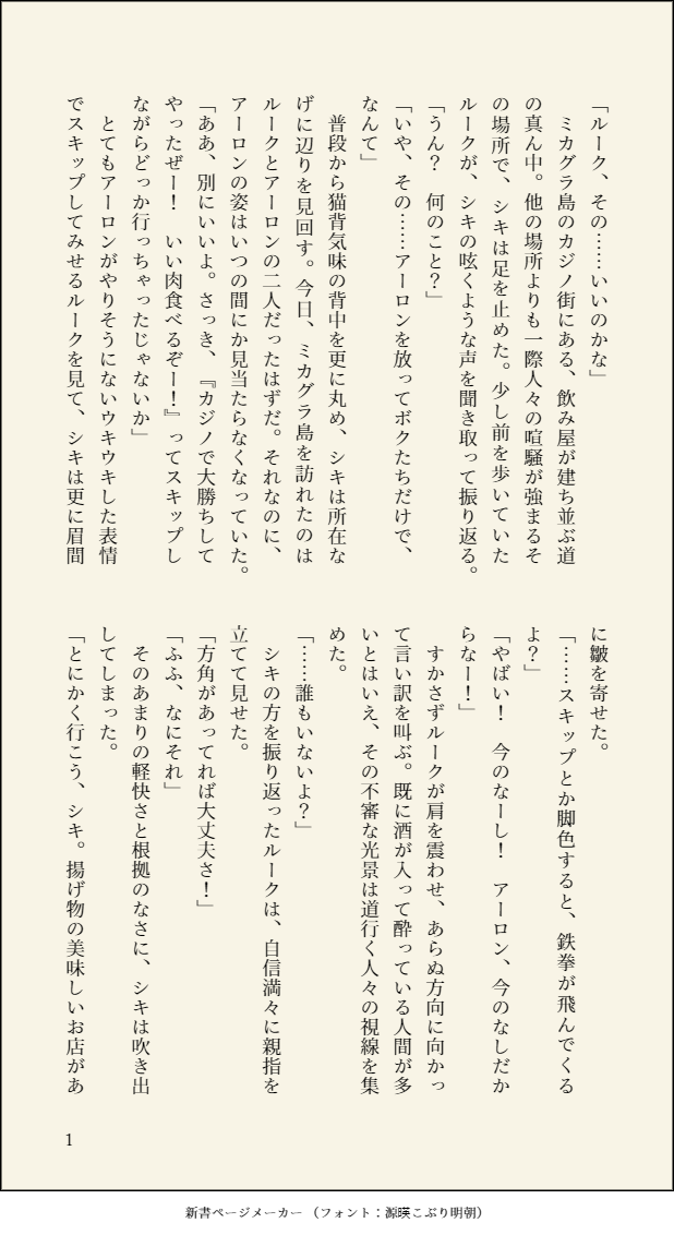 satm_vxy10☆quiet followDOODLE9/19のExtraMission!にて無料配布したペーパーです。ルーク&シキのなんちゃってバディエピソード。 show all(+5 images) Tap to full screen (size:618x1132).Repost is prohibited Let's send reactions! freqpopularsnackothersPayment processing Replies from the creator Follow creator you care about!☆quiet follow satm_vxy10DONE衛拓でオー○ークック2やる話。ほか。 2045 satm_vxy10INFO9月24日 ミッションコンプリート!4で頒布予定の新刊サンプルです。ルーク&アーロン&シキの三人がDISCARDの残党を追って捜査するお話。シキ中心です。シリアス。時系列は「大抗争!ミカグラカップ」の少し後です。※一部に流血表現、死を思わせる表現があります。ご注意ください。よろしくお願いします。 2381 satm_vxy10DONEルーク&シキの短編。ゲームより前の時点で2人がもし出会っていたら…なお話。 9701 satm_vxy10MAIKINGミッコン3で持って行くコピー本のサンプルです。ルークとアーロンとシキが、ルークの家で休日を過ごすほのぼのなお話。 2254 satm_vxy10DONEチェズレイ&シキでルークを遠隔支援するお話。 3291 satm_vxy10DONEルーク&シキで潜入ミッションして戦闘するお話。 2922