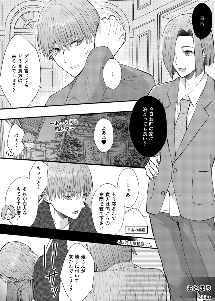 たきひよ漫画(2P)/🐤の部屋にお泊りな妄想漫画(付き合ってる前提)直接的な描写は前回のものより更に僅かですが一応ワンクッション。この後攻防戦すれば良い…