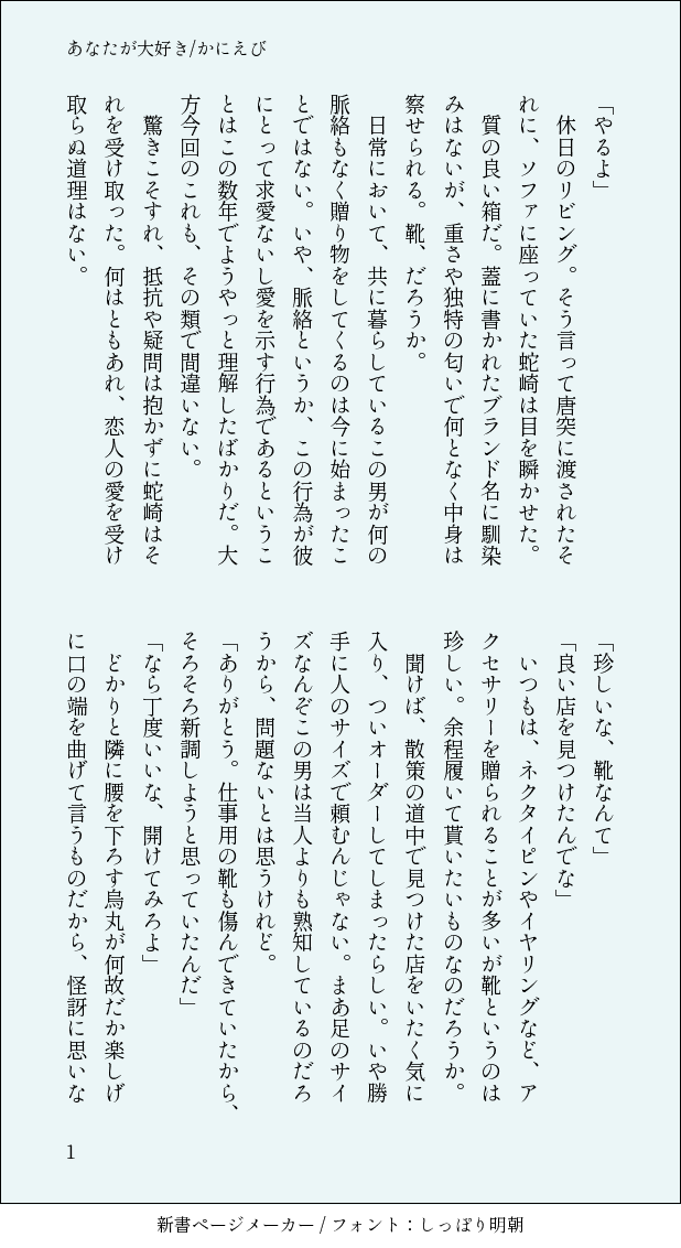 かに水槽☆quiet followDONE烏蛇とヒールSS ##にあ烏蛇 show all(+6 images) Tap to full screen (size:618x1132).Repost is prohibited Let's send reactions! freqpopularsnackothersPayment processing Replies from the creator Follow creator you care about!☆quiet follow かに水槽DOODLEあらやつスケベ絵 2 かに水槽DONE第五ノ七億不思議「絶対青春都市」その性質は「青春」。辛い思い出も、楽しい思い出も、全てが青春となって胸に心に魂に、深く刺さって抜けなくなる。だが、青春は人生の青い春、いずれ過ぎ去ってゆくものだ。烈駆と銀二は自分たちの未来を掴むため、学園へと乗り込んだ。これにて企画「ブツメツフクマ」運営期間中のストーリーは完走!めちゃ楽しかった…!一年間本当にお疲れ様でした! 2 かに水槽DOODLEうちよそマトメターノ 12 かに水槽DONE第四ノ七億不思議「旅立ちの否認」②雨の根源はこの夜空に在る。それを知った烈駆と銀二は空を目指すため、己の師匠の協力を仰ぐべく合流するが…。 4 かに水槽DOODLE落書きマトメターノ(~9/11) 12 かに水槽DOODLE海行ったやつ! 7 recommended works ね🍋のDOODLE joshua_birdyDOODLE nokonokoDOODLEらくがきのマフィアパロ(敵対) そんなにエロくないので気持ちはR15パス▶︎18↑(yes) 2 梶木鮪DOODLEわんわんとふわふわちゃん時々ネコチャン※ケモ耳、擬獣化注意※主ちゃんの顔が出てる himDONEヒカアグ小説 エピローグ後両思い遠距離恋愛の二人が添い寝する話 5 ゆもやまDOODLE 2 G4ME_YMODONE f0u_XDOODLE銀鐧の子作りの話がっつりしたくて隔離小説じゃなくてついーとみたいなノリの怪文書です 2221 y0w0y_PAST時系列とかジャンルとかクオリティが全部バラバラの見れる部類の過去絵再掲たまに年齢制限 30