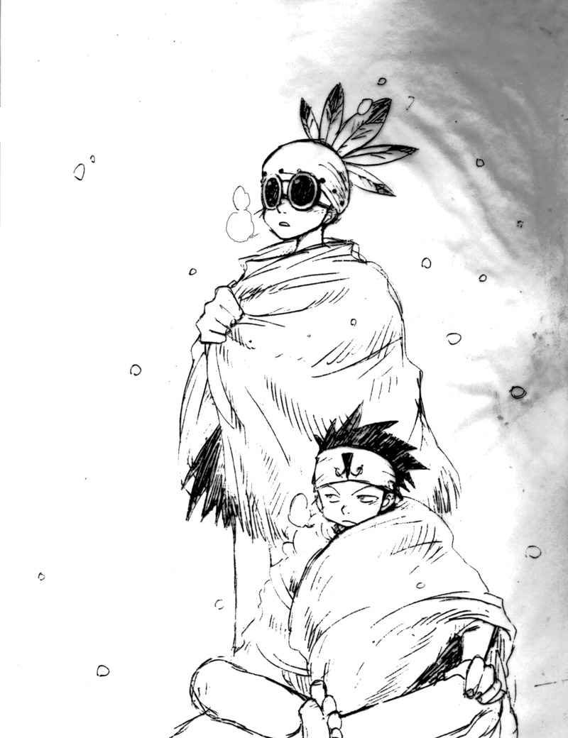 一枚目、冬コミ用ペーパーに雪の日の絵が描きたくてちびっこ二人に寒い中外に出てもらいました