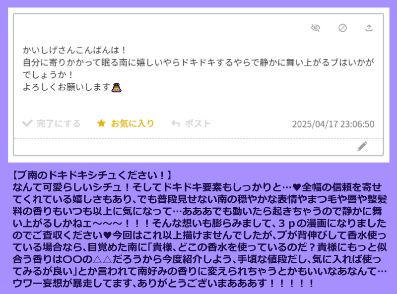 4月にXとブルスカでお声掛けさせていただいたものです。お題箱に頂戴したお題を描かせていただきました!素敵なお題をありがとうございます♥(2/2)