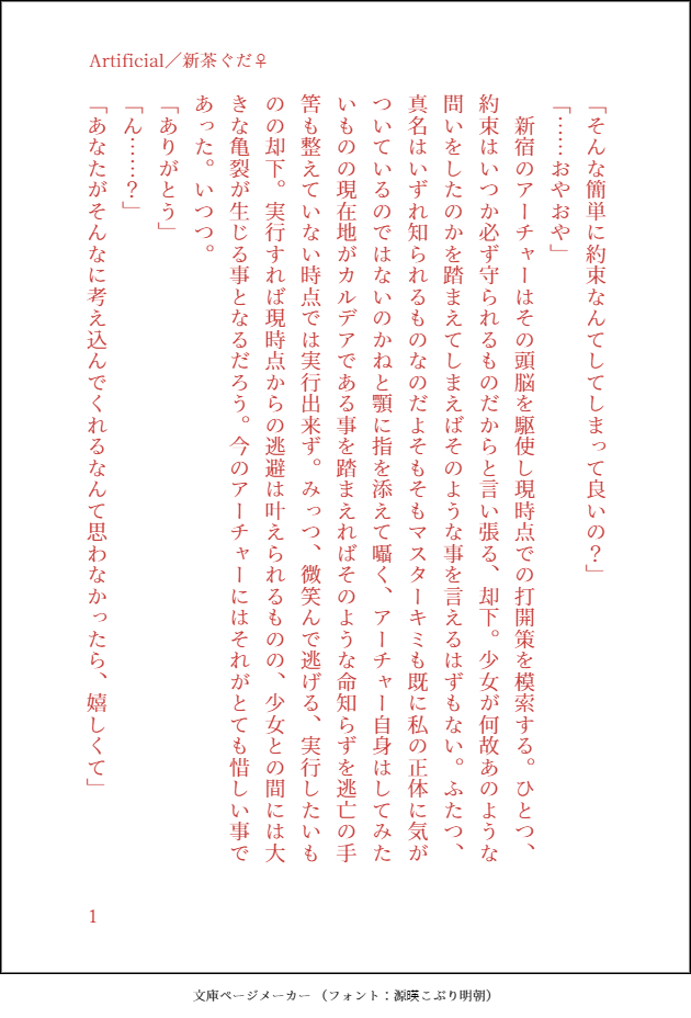 kagome_light☆quiet followDONEArtificial/新茶ぐだ♀ #新茶ぐだ♀ show all(+1 images) Tap to full screen (size:630x928).Repost is prohibited Let's send reactions! freqpopularsnackothersPayment processing Replies from the creator Follow creator you care about!☆quiet follow kagome_lightDOODLEpudding/道リン 2 kagome_lightDOODLEMerry merry/フシヤマ 2 kagome_lightDONE馳走/道ぐだ♀ 4 kagome_lightDONE一句/みかさに(※老女) 3 kagome_lightDONE遠吠え/ハン♀→ウツ 2 kagome_lightDONE好奇/道リン紫(※???) 3 related works まや^._.^DOODLEupした絵の小話で新茶ぐだちゃん。見なくても読めると思います。全体にぎこちないのはお許しください。貴方のためのドレスコード「それでさ、君は誰の為に装うんだい?」 糸紡ぎの妖精が、朗らかに、優しく、問いかけた。 木々の合間を通り抜ける風が心地好い。 設定は少し汗ばむくらいの気温らしいので、余計に清々しく感じる。この爽やかさは少しの煩わしさがあってこそ。なるほど、流石に豪語するだけある。 覆うほどではないが、見通せるほどまばらでもない木立ちの中。そろり、そろりと足を進めていた立香は立ち止まり、辺りを見回す。 「んー…」 ここまで送ってくれたサーヴァントが示したのは、この森の奥だった。 「そんなに深い森には見えなかったんだけど…」 しかし、目当ての姿は未だに現れない。来た方を振り返り、行く先を振り向き。 『この奥で、お待ちになっています』 7518 きふゆREHABILI今年リメイクが出た某ゲームパロ。出会いのシーンをパロしたかっただけ。この場合の黄色はホムになる某薔薇と美術館のパロな新茶ぐだ♀赤い薔薇を一輪とお気に入りのレースのハンカチを持って摩訶不思議な美術館を立香は進んでいく。薔薇の花弁が落ちる度に、鋭い痛みが走るので動く美術品から隠れながら進む。進んでいけばうつ伏せに倒れている人がいた。 「あの……?」 声をかけるが反応はない。小さくうめき声が立香よりもずっと年上の男の人だ。辺りに青い花弁が何枚か落ちている。しかし薔薇を持っていない。 「もしもし……大丈夫ですか?」 もう一度声をかけるがやっぱり反応はなくて。手に持ってキラリと光る鍵があった。 (そういえば鍵がかかっていた部屋があったかも) 道中に鍵がかかっている部屋を思い出す。申し訳ないなと思いながらも握っていた鍵を抜き取った。 「いやぁ助かったヨ。お嬢さん」 985 きふゆDONEhttps://www.pixiv.net/novel/show.php?id=18367839の設定の吸血鬼新茶と新茶に血を飲んで欲しい立香ちゃんによる攻防戦(?)になります。逆襲されちゃう話「そんな薄い格好だと風邪を引いてしまうヨ」 そんな言葉と同時に立香の肩にふわりとショールをかけられた。淡いオレンジ色のショールは立香が持っていないタイプの物だ。ショールに触れれば、柔らかくて高価な物だって分かってしまう。 (また買ったんだ) 立香の物ではないそれはいつの間にかモリアーティが買って準備していた物だろう。立香が断っても大人の財力だヨ、受け取って欲しいと結局押し切られてしまう。 (それなら代わりに私の血を飲んでくれたっていいのに) 対価ではないけれど、さりげなく髪を触って首筋を晒してみる。あわよくば……と思っていても彼は騙されてはくれない。首筋にショールがさらにかけられてしまった。 「……お礼なのに」 868 きふゆMAIKING去年の今頃、いつしかの小ネタを本にしようとしていた供養(理由:長くなりそうだったから)(しかしこの後書いてたやつの方が遥かに長くなってしまった模様)バーテン新茶とJKぐだ♀原稿だったものの冒頭。自分が場違いだと思いながら立香は店内に入った。青を基調とした店内。店内にいるお客は皆、大人の人だ。それはそうだ。ここはバーだ。高校生の立香にはまだ早すぎる。 「ね、ねぇオルタ……」 目の前をどんどんと歩いていたジャンヌオルタに声をかける。声だけじゃなくちゃんと止まって欲しいので彼女の服の裾も掴んだ。 「……何よ」 ちゃんと立ち止まってくれたジャンヌオルタは立香の方を振り返った。他人が聞けば不機嫌そうな声だが、彼女と家族である立香には怒ってないことは分かっている。 「ここ私がきてよかったの……?」 辺りをキョロキョロと見ながら小声で尋ねる。よほど不安げな表情をしていたのだろう。ジャンヌオルタはため息をついてから、自分の服の裾を掴んでいた立香の手を掴んだ。 1758 まや^._.^DOODLE肌色見えてるのでワンクッションです。彼シャツネタ。スタンプありがとうございます〜!励みになっております。 2 きふゆDONE以前出した新茶ぐだ♀本のその後の話。なんやかんやで付き合っている。元別のカルデアモリアーティとそのカルデアの夢を見ていた立香というのだけ頭に入れて貰えたら分かると思います。『さよなら My Ladyその後』カルデアのどこにいても香るチョコレートの匂いに霹靂する時期……バレンタインだ。毎年恒例なので大量のチョコレートを作ることにも、そのお返しとして様々な(本当に様々な)プレゼントがお返しに貰えることにも慣れてしまった
