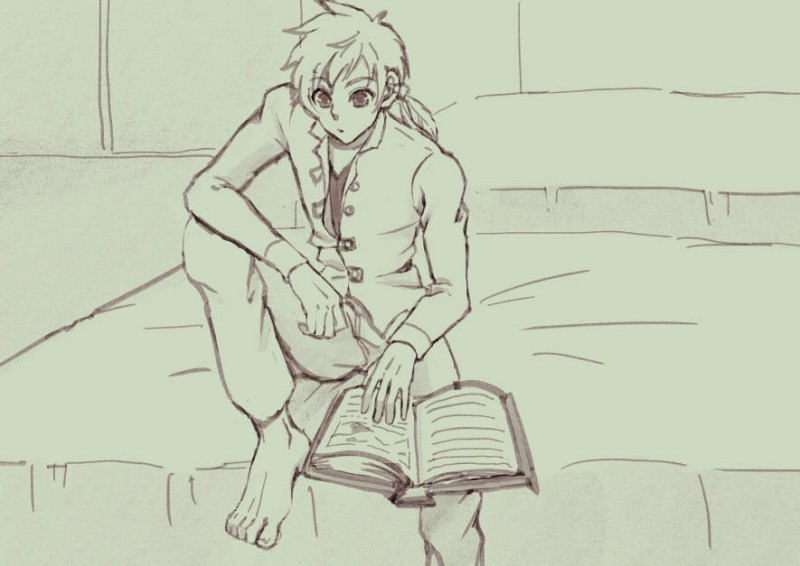 本を眺めるスレイくん