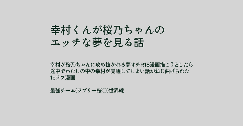 kii_tns☆quiet followDOODLE夢落ちならなんでも描けると思い立ち、桜乃ちゃんが幸村リーダーを攻め抜くえっちな漫画を描こうと思ったのにいつのまにかこうなってしまった付き合っていない幸桜R15漫画(ギャグ!)の1ページなんでも許せる方は良ければ…一生懸命攻め抜くさくのちゃんは倉庫アカウントの方でリベンジします… show all(+1 images) Tap to full screen (size:1748x912).Repost is prohibited Let's send reactions! freqpopularsnackothersPayment processing Replies from the creator Follow creator you care about!☆quiet follow kii_tnsDOODLE裸々さんへ kii_tnsDONEハロウィン桜乃受けお絵かきチャットログ🎃(&らくがき)濃い幸せハロウィン空間ありがとうございました!!!メンバー:さくらさん、ささきさん、ぱらださん、真那兎さん、さくらいさん、ともえさん、しあんさん、ばにらさん、空色ねずみさん 5 kii_tnsDONEお絵かきチャットログ🌻お話、見学、ありがとうございました!・前半:サマバレ・後半:てづか部長が裸のさくのちゃんにジャージを着せる、というシチュエーションを中の人がラジオでやっていた、という話を聞いて(絵:さくらさん、ささきさん、真那兎さん、泡風呂さん、ばにらさん、自分)ーーーーーーーーーー・その他:以前お絵かきチャットで描いたもの 幸桜はばにらさんとの合作! 5 kii_tnsDONEてにこいの展示作品です。「約束、バレンタイン」幸村×桜乃 漫画18P幸→桜→リョベースの、バレンタインにまつわる2人の少女漫画風味のお話です。⚠️パスワードはイベントの店舗にて。⚠️一部描きかけのコマがあり後ほど絵の差し替え予定(すみません🙇♂️) 20 kii_tnsDOODLE即堕ち2コマ、という文化を教えていただいて描いてみた青春の幸桜即堕ち2コマ漫画🔞⚠️パスワードは倉庫アカウントで公開してるもの⚠️ファンタジーです! 2 kii_tnsDOODLE描きたいところだけ描いた幸桜エロ🔞※skb表現練習兼ねてかいたので直接的な表現と修正多め※続くかも…⚠️パスワードは倉庫アカウントで recommended works an-chanDONEポーズは著作権フリーのサイト様を参考に an-chanDONE別バージョン桜乃。最近桜乃ちゃん出てるし盛り上がってて最高。 よしよしPAST mizuDOODLE 3 Moromoro_03DONE攻めフェラ イトアキ成人済みですか?(Yes or No) dokudamisbkREHABILI072の日に描き損ねてたネタ kogma_bMOURNING⚠️腐なのでワンクまえに描いた頭わるいやつせっかくの記念日ですのでー#伊食満の日 王文王木支DOODLE【御天敌】煎原稿的无头尸,反正他身上有洞就插了,能接受再看…… 葉月栞DONETwitterに載せたものの差分