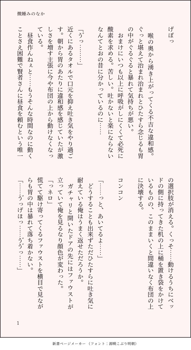 moyu_mochi☆quiet followDONE体調不良小説です基本的にねろ弱ってます #魔法使いの約束#まほやく#ネロ show all(+28 images) Tap to full screen (size:618x1132).Repost is prohibited Let's send reactions! freqpopularsnackothersPayment processing Replies from the creator Follow creator you care about!☆quiet follow moyu_mochiDOODLE2022年9月から2024年5月のらくがきまとめあと個人的に記録として残しておきたい子も入れてます基本ネロとファウスト1個だざいとちゅうや(だざい女体化)全てに体調不良表現含みます 22 moyu_mochiDONEC103の新刊サンプルR1818未満は閲覧禁止パスワードはTwitter本垢のIDハイフンなしまたは、タイッツーのIDハイフンなし 10 moyu_mochiDONE2023年11月4日発行『久遠の夢は朝焼けのように』7P~14PパスワードはTwitter本垢のIDの_なしタイッツーのID_なし↑両方同じなのでどっちか知ってる人はいけます 8 moyu_mochiDONE2023年11月4日発行『久遠の夢は朝焼けのように』1P~6PパスワードはTwitter本垢のIDの_なしタイッツーのID_なし↑両方同じなのでどっちか知ってる人はいけます 7 moyu_mochiPROGRESS11/4のサンプル過去1私のお話最高では!?になってるので見て見てするパスワードはTwitter本垢のIDの_なしタイッツーのID_なし↑両方同じなのでどっちか知ってる人はいけます今の所サンプルと一緒やけど、最後まで見て〜〜〜最高だから(自画自賛) 8 moyu_mochiDONEネファ現パロwebオンリー『ネオンの現に祝杯のファセット』開催おめでとうございます!大学生で1人暮らししている2人体調不良表現含みます隣人で体調崩したネロをファウストが自宅に連れ込んで看病するお話ですパスワードはお品書きにあります 2614 related works mitsui_361DONEねろろ 2 とりにくDOODLEネロちゃんがかわいくてだいすき 3 楸ロコDOODLEDCFF7 ネロrkgk tk.DOODLE ヨヨヨのよし平TRAINING賢者さん、明日の朝は何食べたい?#まほやく_FA 83101414DONE 2 ヨヨヨのよし平DOODLEネロをめちゃくちゃ褒めたら#まほやく_FA 🏠ウチMOURNING大乱闘DMCブラザーズ 2 オムライスDONE今年も残りわずかということでクリスマスにかこつけて年初に活躍した約20年ぶりのなつかしきCCさくら、なおかつ季節的にサンタのイメージでネロ様、声優つながりでパドらせようっていう、 そんな2018年記念イラスト。みなさんメリークリスマス。投稿したの26日だけどね(;´∀`) pixiv URL はこちらhttps://www.pixiv.net/member.php?id=13234350 recommended works にゃんちゅうDOODLEお灸でリラックスするネロちゃん。11月08日の「いいおっぱいの日」が終日仕事だったせいでおっぱい絵をツイートできず(ツイートできるほどおっぱい絵を描いてないけど)、腹いせに11月09日を勝手に「いいお灸の日」ってことにして描いた絵。 ばるたぁDONE出張☆フィガロ先生!〜東の国〜 kei_liliaDONE色塗りも!やりました!!!オズを描いて楽しかった!!! チトセリクリDONEムルちゃん かすた丼(ぺん草)DOODLEウサギのシノヒス…(願望) beeflvsDOODLEオーエンの誕生日、おめでとうね~ アサヅマREHABILI20201124Twitterのアイコン変えたくて描いた🤭1枚目:加工、2枚目:加工なしだけどあんまり変わらなかった!色がいつもわからなくなるから潔く公式からスポイトしたらちょっと絵がうまい気分になれたのと、勉強になったのでしばらくこれでリハビリして行こうかな〜とおもいました(日記) 2 砂肝串DOODLEよいお年をはなんぼいってもいいですからね!よいおとしを!2020年分まとめました。進捗とかはここにしかないですが…https://www.pixiv.net/artworks/86667527 2 Hugh_kakuhouPROGRESS出来上がるといいな