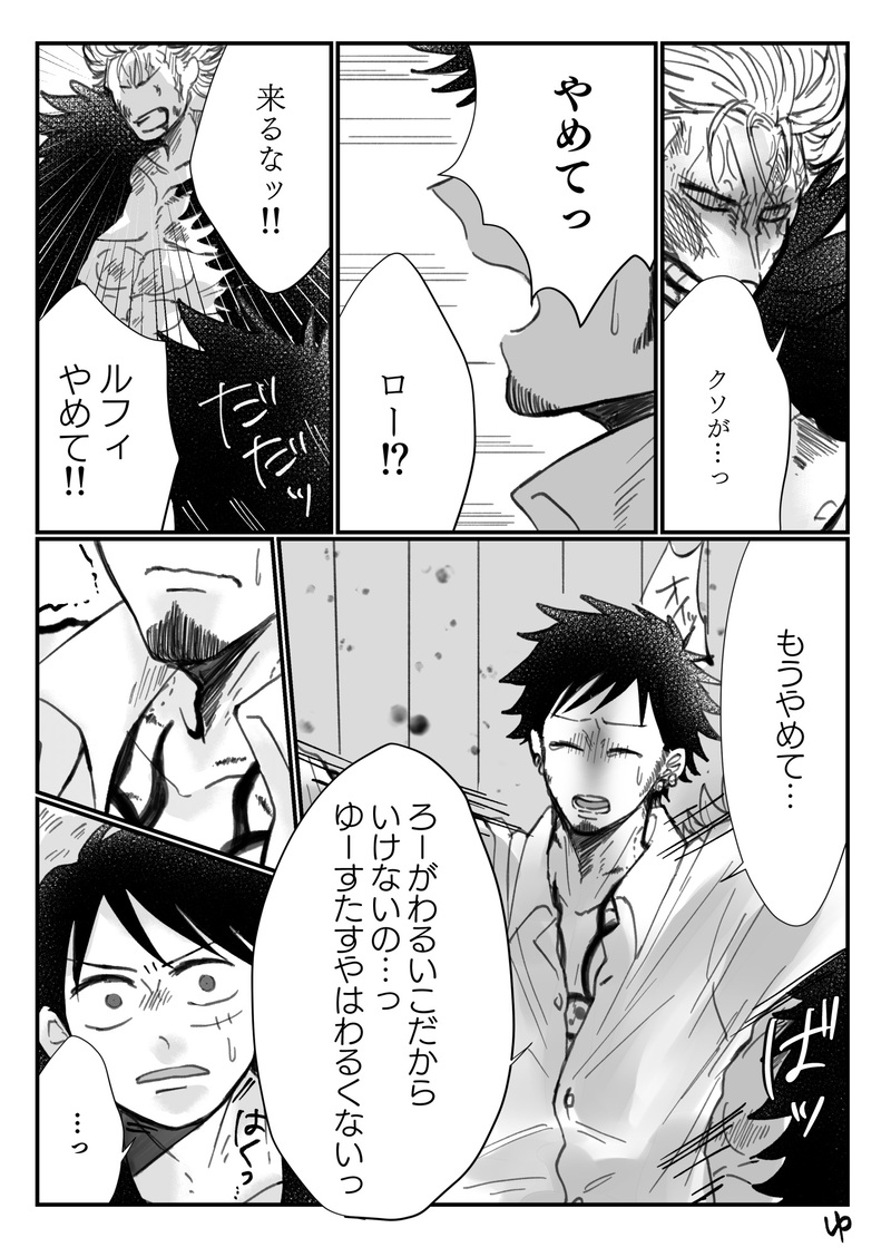 『🐯を助けにやってきた👒一味。無理矢理攫っていったであろう🌷に制裁を食らわせていた最中轟音で我に返った🐯が飛び出してきて🌷を庇い立ち塞がり「ろーがわるいこだから!🌷は悪くない!」と叫ぶ姿が🌷との情事を色濃く残したもので唖然としてしまう👒…』部分