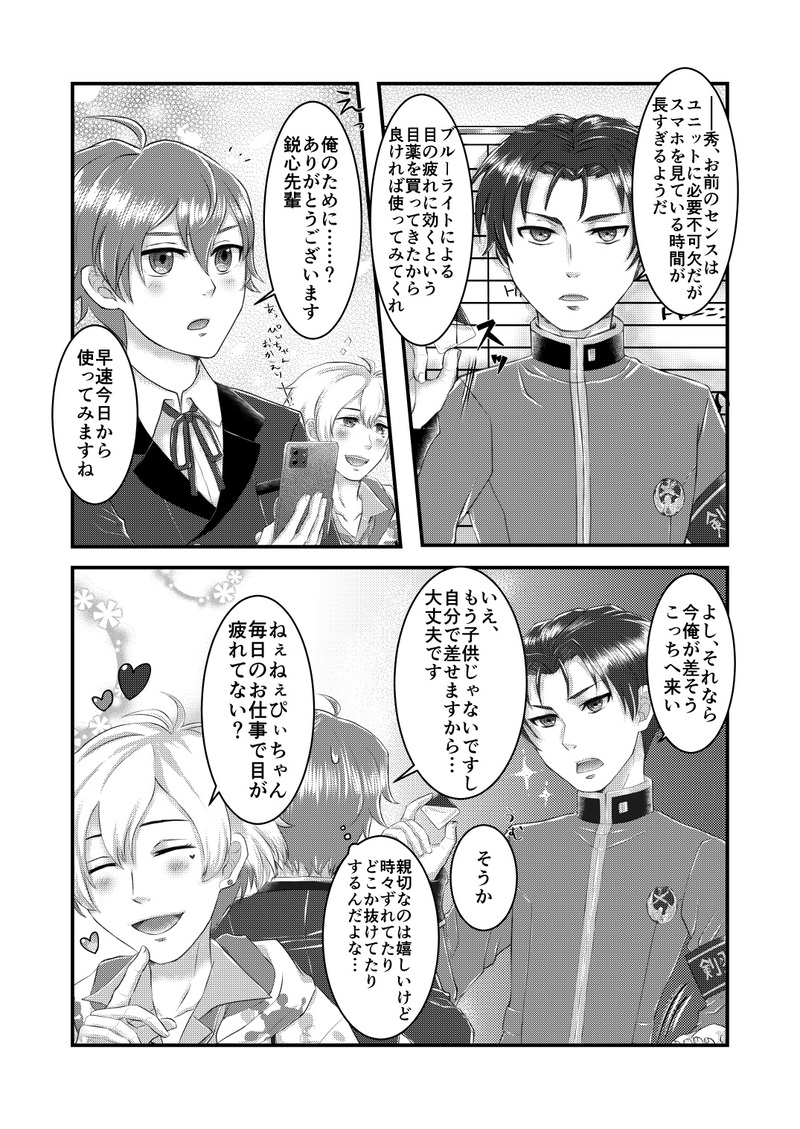 ひおり☆quiet followDONE鋭心君が秀君の目を心配するLINKのトークがとても好きで、そこから妄想したクラファ1ページ漫画ネタ自体は結構前に思いついていたのに完成させるまでに時間がかかってしまった…やっと完成してうれしいのでポイピクにも載せてみる Tap to full screen (size:1075x1518).Repost is prohibited Let's send reactions! freqpopularsnackothersPayment processing Replies from the creator Follow creator you care about!☆quiet follow ひおりDONE6月に出した秀鋭本の1ページとして考えていたものの台詞が上手くまとまらず没にしたもの 割と気に入っていたので今回形にできてうれしいです!カルト映画はホラーのみではないのですがいい感じのイメージが浮かばずホラー的なコマになってしまいました… ひおりDONE6月に出した秀鋭本に載せたかったものの時間がなくて描けなかった10年後妄想でした 今回も時間がなく塗りがラフなのでいずれきちんと完成させたいなあ…リメショも見たいですが未来の姿も見たい!公式で見られる日はなかなか来なさそうなので描きました。出来はいつにも増して残念ですが楽しかった! ひおりDOODLE以前からずっと頭の片隅にあった「鋭心君が彼シャツをしたら下着が見えてしまう妄想」を形にした秀鋭らくがき 制服交換ネタも元々はこの妄想から派生したものでした…先週の1コマでやっと鋭心君も夏めいた私服になりましたが、露わになった腕の太さが隣の秀君よりかなり太くて最高…とにやにやしています 前から並んだ立ち絵の手の大きさや足の太さの差を見る度に一人盛り上がっていたけどまた萌えポイントが増えてしまった ひおりDONEホワイトデーが去年未完だった絵を完成させたものだけだと私が寂しい…と思って描いた去年の続きのような秀鋭2コマ 大真面目にかわいいことをする鋭心君とちゃんと突っ込んでくれる秀君が大好きです ひおりPAST2024/1/28発行の秀鋭アンソロに参加させて頂いた時の4コマ漫画の再録です。秀鋭の制服交換が見たい!どっちも似合いそう!という妄想に体格差萌えを合わせて描きました。4コマ目のテキストにすごく悩みましたが、その甲斐あってか自分では割と気に入っていたりします。 ひおりMAIKINGスクラッチ情報が出る前に描いていたクリスマス秀鋭アナログざっくりラフ 構図だけは気に入っているからいつか描きたいな~の気持ちを込めて載せておく recommended works もりくんPROGRESSギムナジウム幼馴染 ひおりPAST315プロNightに夏旬の中の人が初めてゲストに来たとき(お互いにあだ名を決めた回)に描いたもの もう6年前になるんですね…当時採用して頂いてとてもうれしかったです…! yuran39_mDONE夏旬プチ、『夏は恋する冬の音』開催おめでとうございます~~~テーマもなにも関係なくなってしまった すみませんネットプリントにも登録しています。(ローソン・ファミマにてユーザー番号:RKWP5JHNDB)~7/2 16 mtk1600PROGRESSしゅ〜えい進捗…描き慣れない😭 3 Itsuku EntoDOODLEWinnie Auggie ColdFront wip 4 kiwii_changchuDONE【凛洁】无尽夜是约稿,文/clear亲吻你,舔舐你,吮吸你,咀嚼你,啃噬你,吞咽你。——爱你。爱你。未知生物凛x研究员洁悬疑恐怖小故事,含大量人外/伪人描写。 5 ほや🐟DOODLEママにほっぺチューされて照れてるシン・コナンくん kuge_96DONE eleson_daisukiDOODLEみやび クリスマス