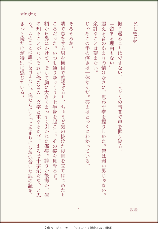 みなぽよまる☆quiet followDONE【腐】敦隆「疼痛」の隆景サイドを書いた。この2人、幸せになってほしい。幸せにするのは…誰?!俺!?俺俺俺俺!!前作「疼痛」はこちらhttps://poipiku.com/3848972/8714817.html #半死 halfDead #敦隆 dunlong show all(+7 images) Tap to full screen (size:630x928).Repost is prohibited Let's send reactions! freqpopularsnackothersPayment processing Replies from the creator Follow creator you care about!☆quiet follow みなぽよまるDOODLE今日の日記Plastic Tree PTツアーAct.2 "トロイメライ"千葉 みなぽよまるDOODLE敦隆の短いやつ 本に入れるかも入れないかも 5 みなぽよまるDOODLE敦隆!!!!! 2 みなぽよまるDOODLE敦隆 今日はしっくすないんの日 みなぽよまるDOODLE6月の夜臼シン みなぽよまるDOODLE5月の夜臼シン related works bunbun0rangeDONEバレンタインの敦隆。2022年ver恋人同士の2人が迎える初めてのバレンタイン「手作りも用意してる敦豪がまず渡してみたチョコ」と「自分はデパ地下で買った隆景が渡されたチョコ」チョコをくださった方、ありがとうございます! 1203 みなぽよまるDONEとある世界線の敦隆説明書。 みなぽよまるDOODLE【腐】敦隆。ハロウィンのバンパイアdevaの隆景ヤベェ〜!と唐突に狂ってロングコートの隆景を描こうとしたのに全然ロングコート書いてない。バカ。ザ!BL!って感じでお気に入り。 bunbun0rangeDONEコ様視点のコ+敦+隆の話。メタ発言あり。この話は敦隆、コウ隆、コウ敦の世界線があることを書きつつも、ラブを微塵に感じさせないギャグに近い話です。カップリング要素ほぼなし。なんなら、本人不在。 2349 bunbun0rangeDONE敦隆。付き合ってないけど、両想いのあの妙にくすぐったい時期。糖質100%読んでいる人が恥ずかしくてカーッてなる話を作りたかった。書いた私が1番クソ恥ずい。 4504 bunbun0rangeDONE敦隆。クソ甘い。ジャンケンで受けを決める話。 1254 みなぽよまるDOODLE相棒が「毎日寝る前にハッピーラッキーラブスマイルピースドリ~~~ムと唱える皆野」と呟いていたので描いた。まあ隣には…寝ている人がいるよねというわけでおまけは【腐】ガラ幸と敦隆の寝相ポテ 2 みなぽよまるDOODLE【腐】敦隆。はっず!恥ずかしいふたり。きっす!きっす!きっす!きっす! bunbun0rangeDONEバレンタインの敦隆。2022年ver恋人同士の2人。「敦豪が絞ったガナッシュ」チョコチョコをくださった方、ありがとうございました。 1431 recommended works bunbun0rangeDONEIt's always darkest before dawn.(明けない夜はない)敦隆オンリーで無料公開していた小説です。 6697 みなぽよまるDOODLEミニスカサンタの隆景と杁。 みなぽよまるDONE2024年あけましておめでぃ~ば!今年もよろしく! みなぽよまるDOODLE正月の犬猿。 みなぽよまるDONEとある世界線の敦隆説明書。 木叶蘑菇种植户DOODLEマダ柱 みなぽよまるDOODLE4月の夜臼シン Salmo_NegitoroMEMO2025.1.1 卓始め みるくSPUR MEあけましておめでとうございます。デイメル&ケビスチュの4Pです。一応姫はじめのつもりです。何やかんやあって描きました。