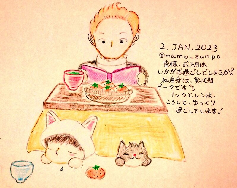 リックとレンは、こたつでお正月を過ごし、初詣も行きました。