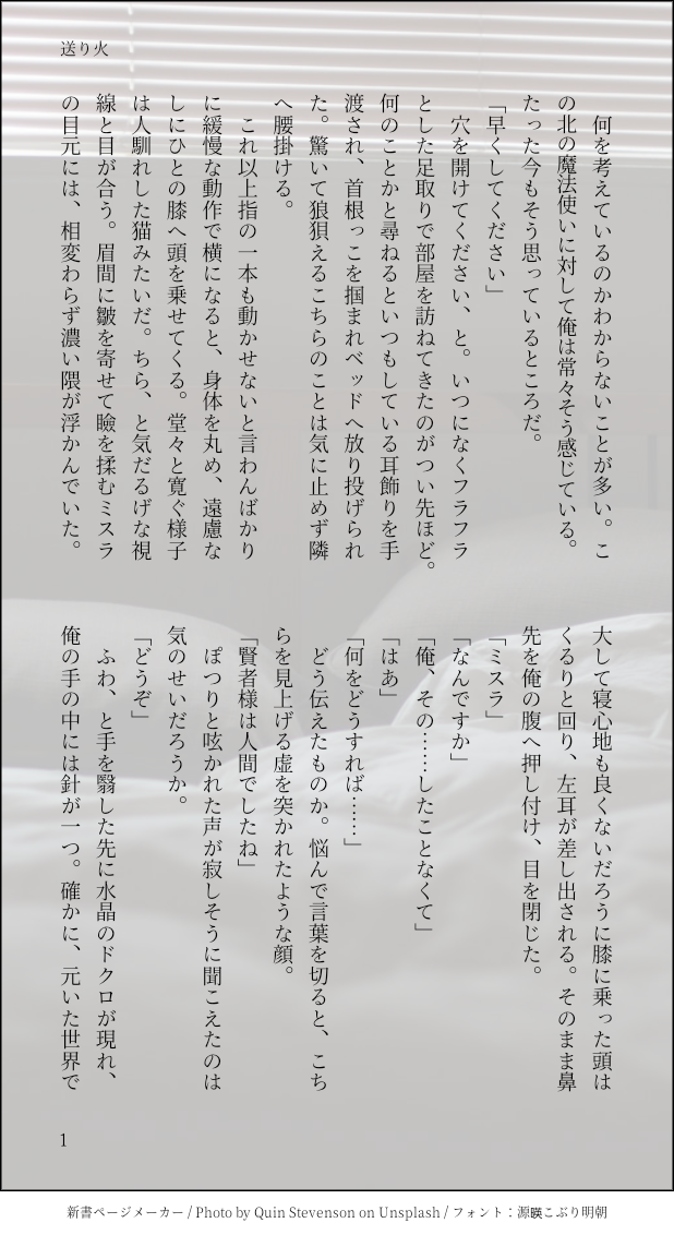 steadfastm_f☆quiet followDONE送り火/晶ミス三スラ受けワンドロワンライで書いたものです。お題はお盆で書きました。 show all(+3 images) Tap to full screen (size:618x1132).Repost is prohibited Let's send reactions! freqpopularsnackothersPayment processing Replies from the creator Follow creator you care about!☆quiet follow steadfastm_fDONE第13回ミ受けワンドロワンライで書いたものです。お題はずぶ濡れ、拘束、ぶるぶるローズでした。 2290 steadfastm_fDONEミ受けワンライにて第九回お題「祝福」「匂い」で書きました。晶ミスです。 2564 steadfastm_fDONEミ受けワンライにてお題扉、喧嘩、マドレーヌで書きました。不意に元の世界に戻ってしまった賢者をミスラが迎えに来る話です。 3785 steadfastm_fDONE晶ミスを中心に事件に巻き込まれる魔法舎の魔法使いたちなお話です。軽めの性的表現があるのでR18とします。 33480 steadfastm_fDONE送り火/晶ミス三スラ受けワンドロワンライで書いたものです。お題はお盆で書きました。 4 steadfastm_fDONE俺と貴方の間のこと/晶ミス三スラ受けワンドロワンライで書いたものです。お題は傷で書きました。 4